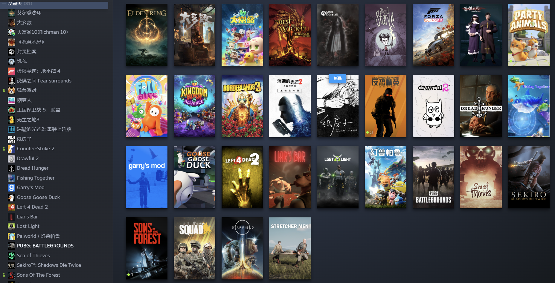 我们到了吗?/房车还在那里/房车有吗(RV There Yet?)、纸房子、骗子酒吧、王国保卫战5联盟、担架工/担架人(STRETCHER MEN)、恶意不息(No Rest for the Wicked)、幻兽帕鲁(Palworld)、最终决战(The finals)、动物派对/猛兽派对预购版、星空预购版(Starfield)、森林之子(Sons Of The Forest)、打工模拟器/大多数(Nobody - The Turnaround)、消逝的光芒2人与仁之战(Dying Light 2 Stay Human)、艾尔登法环、恐慌饥饿/恐惧饥饿/饥寒与恐惧(Dread Hunger)、求生之路2 Left 4 Dead 2、盗贼之海 Sea of Thieves、战术小队/行动小队 Squad、大富翁10 richman 10、糖豆人终极淘汰赛 Fall Guys: Ultimate Knockout、只狼影逝二度 Sekiro: Shadows Die Twice、极限竞速:地平线4、无主之地3、盖瑞模组、绝地求生大逃杀 (PLAYERUNKNOWN'S BATTLEGROUNDS)、鹅鸭杀、你画我猜2(Drawful 2)