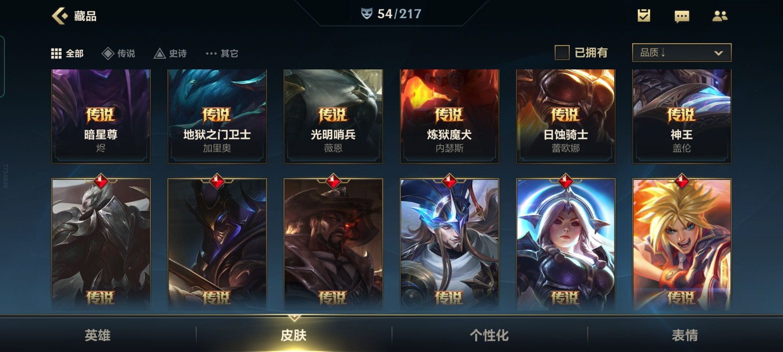 皮肤:神王 光明哨兵 KDA 天煞 劫 炼狱魔犬 日蚀 月蚀 地狱之门 西部魔影 星域游侠 崔斯特 星之守护者 战争学院 福牛全限定 暗星 玉剑传说 泳池派对 银河魔装 原计划 赵云 关羽 苹果机器人 破败军团 猎龙勇士 泰坦 宇航员 水晶玫瑰全套 猩红之月剑魔 摄魂猎手凯隐 灵魂莲华套