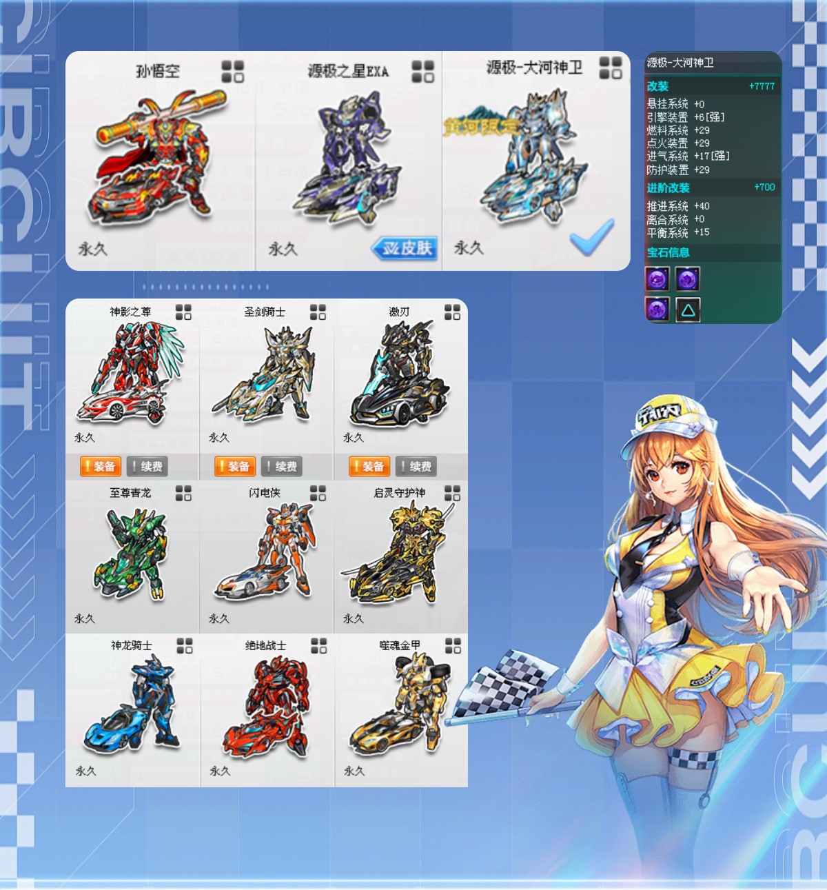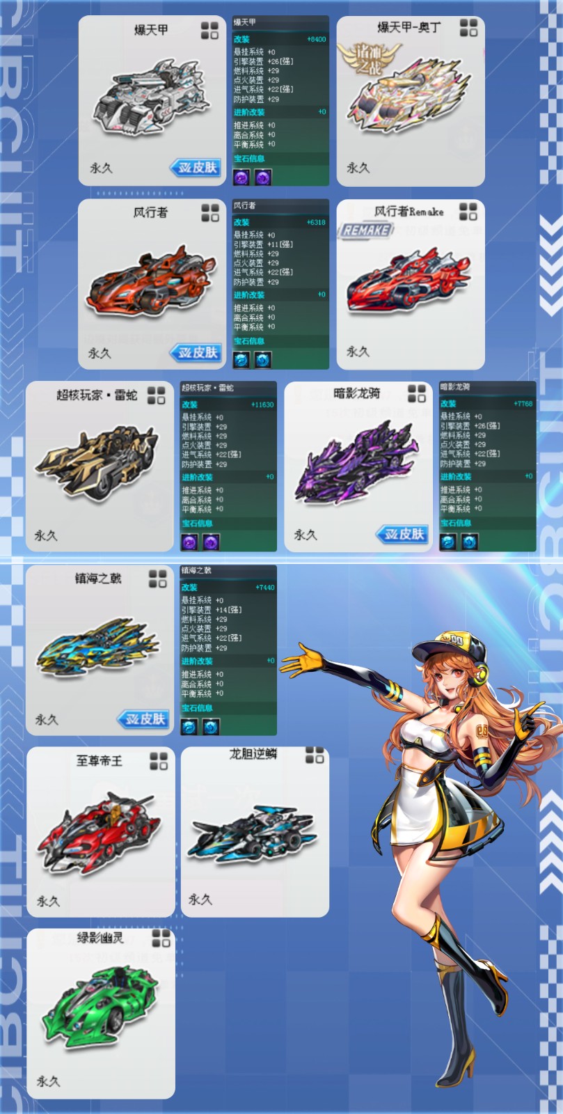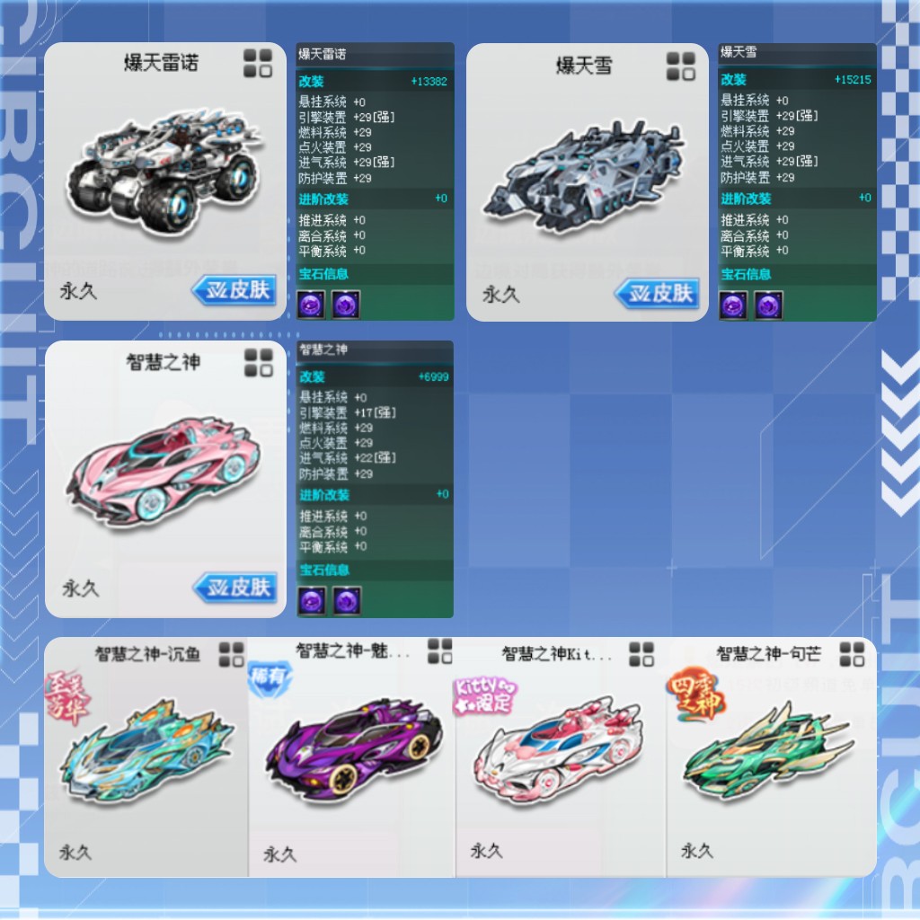 A:骇客,桀骜,阿斯拉达,车轮滚滚,一路畅通,句芒光影,庐山雷诺,幽灵海盗船,凌烈,雅典娜,威震天(29双三级),深海狂鲨,神风玉堂,狱火啸天,星冰之舞,天外之星,缘梦帝王,春日部之影,月光女神,阿波罗,针尖,狂风,锋刃RX-7,B,Duck,刀锋,HelloKitty雷诺,银魂斗士,烛龙弄焰,应龙驭风,青龙占星,幻影绝尘,冰夷踏浪,神圣天使兽,羊羊少女心,光武士,TRUENO-AE86,威霸天,风之弧度,疯狂卡丁,蓝隐神使,逐浪小黄鸭,炽天使,熔岩之心,炽热Q吧,幻影绝迹,童心之翼,闪耀之星,幻变速灵,乘风,逐星者,银闪,指挥官,柯尼塞格(29双三级),缤纷神驹(29双三级),沙漠之狐,冰魄,星际雷诺(29双三级),星河战刃,兰博基尼·传奇,火钻(29双三级),冥宵(29双三级),暗羽魔影,童梦穿梭者,烈焰销魂,追光者,黑夜传说