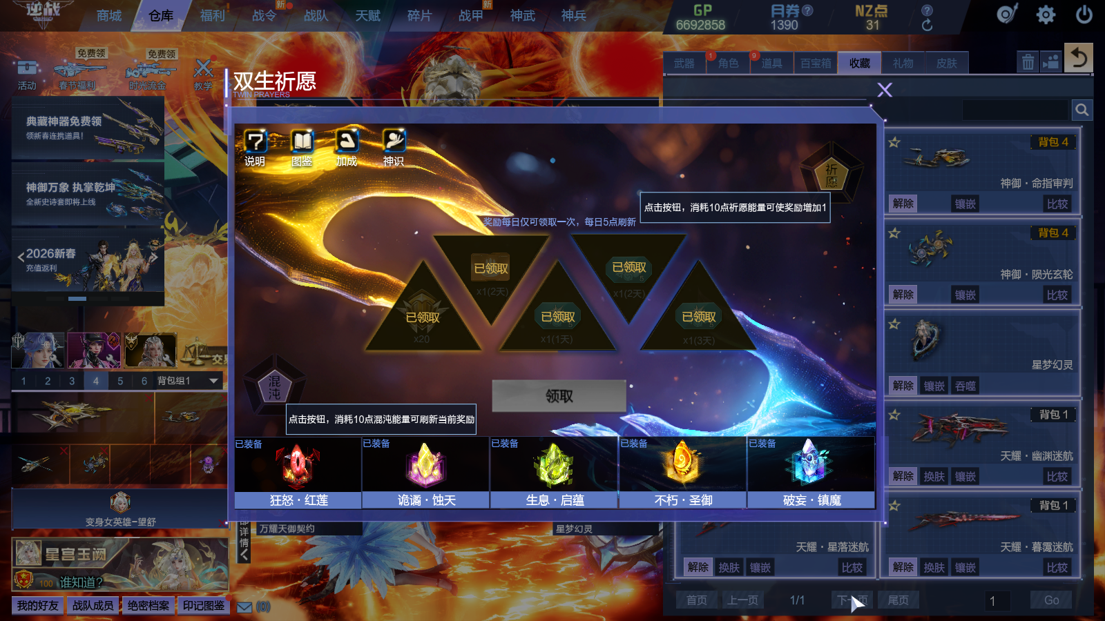 深渊武器30级、神武宝库绀蓝套、奥特曼五件套、塔防陷阱全能卡有很多天、百宝箱三级、泽塔装甲、裁决女帝-龙姬、