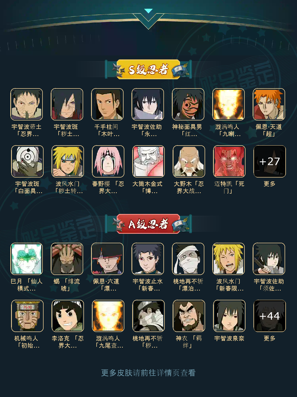 39S 46A 235忍者 千手扉间「漂泊武士」/宇智波止水「新春限定」/宇智波带土「暴怒」/「忍者之路」神秘面具男/佩恩·六道 「漂泊浪客」/长十郎 「六代目水影」/宇智波佐助「疾风传咒印」/神秘面具男 「红夜之刃」/宇智波斑 「秽土转生·解」/千手柱间 「木叶创立」/漩涡鸣人 「九喇嘛连结」/宇智波带土「忍界大战」/宇智波佐助 「永恒万花筒」/迈特凯「死门」