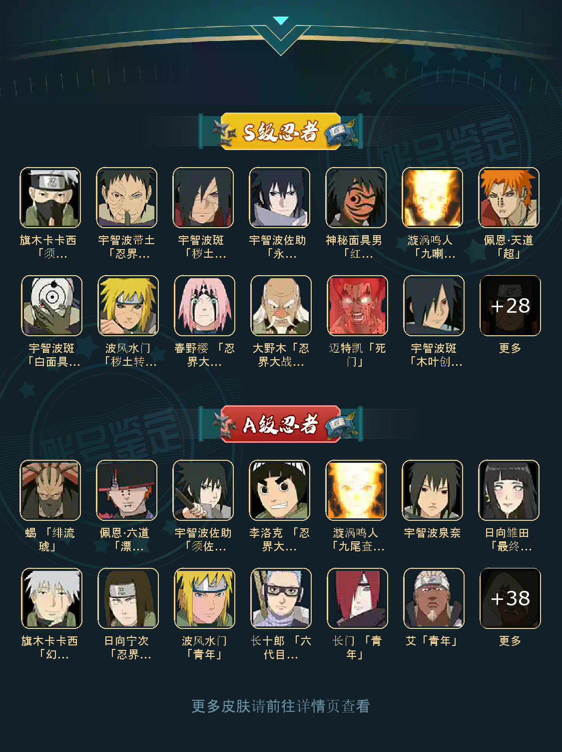 A级忍者(44个):宁智波触,飞段「死司凭血」,角都,飞段,我爱罗「疾风传」,飞阿斯玛「秽土转生」,迪达拉,蝎,迈特凯,猛飞阿斯玛,干杮鬼鲛。宇智止水,小南,旗木卡卡西「万花筒写轮眼」,角都「地怨鹰」,漩涡鸣人「仙人模式」,宇智波佐助「万花筒写轮眼」,猿飞H斩「火影继承人」,照美冥「五代日水!,勘九郎「忍界大战!,春野樱「白豪!,大蛇夷「晓」,秋道丁次「忍界大战」,小南「夏日泳装」,我爱罗「忍界大战」,药帅兜「半蛇斗」千代「近松十人卫」,瀧涡鸣人「九尾査克拉」,猿飞木叶丸「博人传」,宇智波带土「墨怒」迪达技T秽士转生」,宁智波佐助