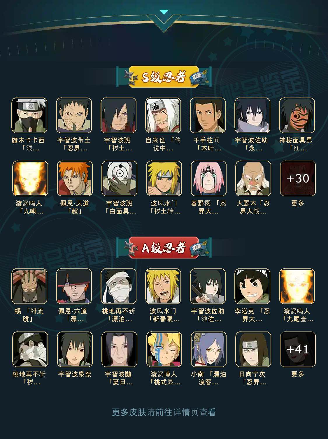 A级忍者(45个):宁智波,飞段「死司凭血」,为都,飞段,我爱罗「疾风传」,飞阿斯玛「秽土转生」,波风水门「新春限定」,迪达拉,蝎,迈特凯,猛飞阿斯玛,干杮鬼鲛,宇智波止水,小南,旗木卡卡西「万花筒写轮眼」,角都「地怨鹰」,漩涡鸣人「仙人模式」,奇拉比,宁智波佐助「万花简写轮眼!,达鲁伊,照美冥「五代日水影1,春野樱「白豪!,大蛇丸「晓I秋道丁次1忍界大战」,小南「夏日泳装」,我爱罗「忍界大战」,药帅兜「半蛇斗」,千代「近松十人卫」,漩涡鸣人「九尾查克拉」,獴飞木叶丸「博人传」