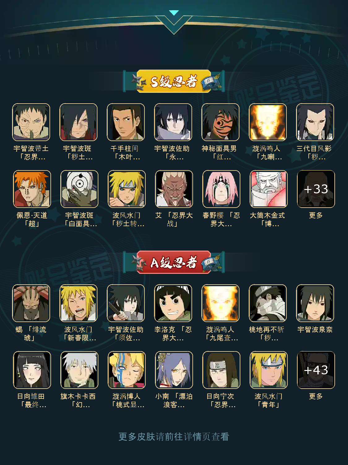 战力:2278W+;VIP14级;S忍45个;A忍49个,通灵兽28个,S忍:5星纲手(普通),5星猿飞日斩(普通),4星仙人模式自来也,4星大蛇丸,4星波风水门(普通),4星白面具宇智波斑,九喇嘛连结漩涡鸣人,永恒万花筒宇智波佐助,忍界大战春野樱,自来也(普通),舞之豪杰自来也,百豪纲手,死门迈特凯,秽土转生波风水门,秽土转生猿飞日斩,秽土转生千手扉间,千手扉间(普通),千手柱间(普通),秽土转生千手柱间,木叶创立千手柱间,宇智波斑(普通),秽土转生宇智波斑,木叶创立宇智波斑,秽土转生解宇智波斑,须佐能乎宇智波鼬,秽土转生宇智波鼬,神秘面具男(普通),忍界大战宇智波带土,红夜之刃神秘面具男,四代目风影罗砂,秽土转生三代目风影,二代目水影鬼灯幻月,四代目雷影艾,三代目雷影艾,秽土转生金角银角,三代目土影大野木,忍界大战大野木,二代目土影无,秽土转生半藏,天道佩恩,超佩恩天道,秽土转生长门,仙人模式药师兜,博人传大筒木金式, ;A忍:5星猿飞阿斯玛(普通),5星干柿鬼鲛(普通),5星迈特凯(普通),5星蝎(普通),4星疾风传我爱罗,4星飞段(普通),4星死司凭血飞段,3星木叶上忍猿飞木叶丸,3星旗木卡卡西(普通),3星宇智波止水(普通),3星九尾查克拉漩涡鸣人,3星宇智波鼬(普通),3星迪达拉(普通),3星青年波风水门,3星秽土转生迪达拉,3星半蛇斗篷药师兜,忍者之路神秘面具男,万花筒写轮眼宇智波佐助,须佐能乎宇智波佐助,最终章日向雏田,七夕限定猿飞阿斯玛,夏日泳装照美冥,桃地再不斩,忍界大战日向宁次,秽土转生猿飞阿斯玛,近松十人卫千代,惊门迈特凯,百豪春野樱,万花筒写轮眼旗木卡卡西,新春限定波风水门,忍界大战秋道丁次,忍界大战我爱罗,五代目水影照美冥,幻之真容旗木卡卡西,仙人模式漩涡鸣人,奇拉比(普通),青年艾,青年长门,晓大蛇丸,新春限定宇智波鼬,忍界大战奇拉比,角都(普通),地怨虞角都,漂泊浪客小南,漂泊武士千手扉间,五代目雷影达鲁伊