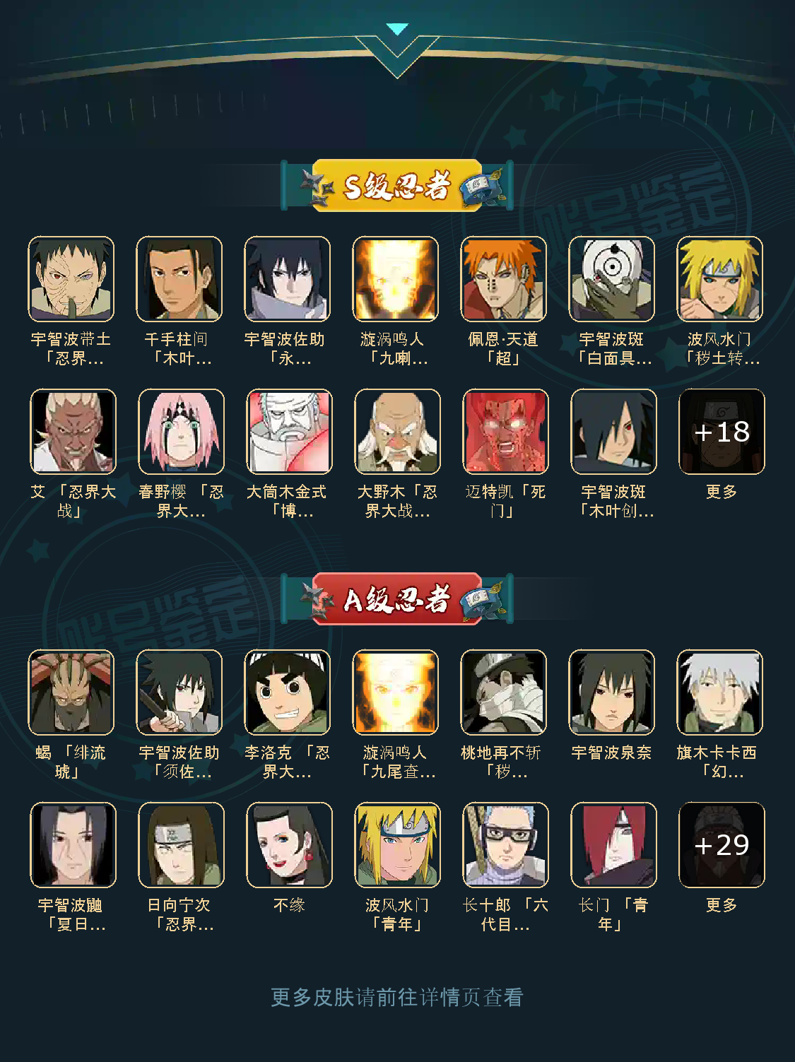 战力:1183W+;S忍29个;A忍32个,通灵兽20个,S忍:大蛇丸九喇嘛鸣人永恒万花筒佐助忍战樱普通自来也死门凯波风水门秽土水门秽土猿飞豪杰自来也秽土扉间千手柱间木叶创立柱间秽土柱间宇智波斑秽土斑木叶创立斑须佐鼬秽土鼬白面具忍战带土罗砂