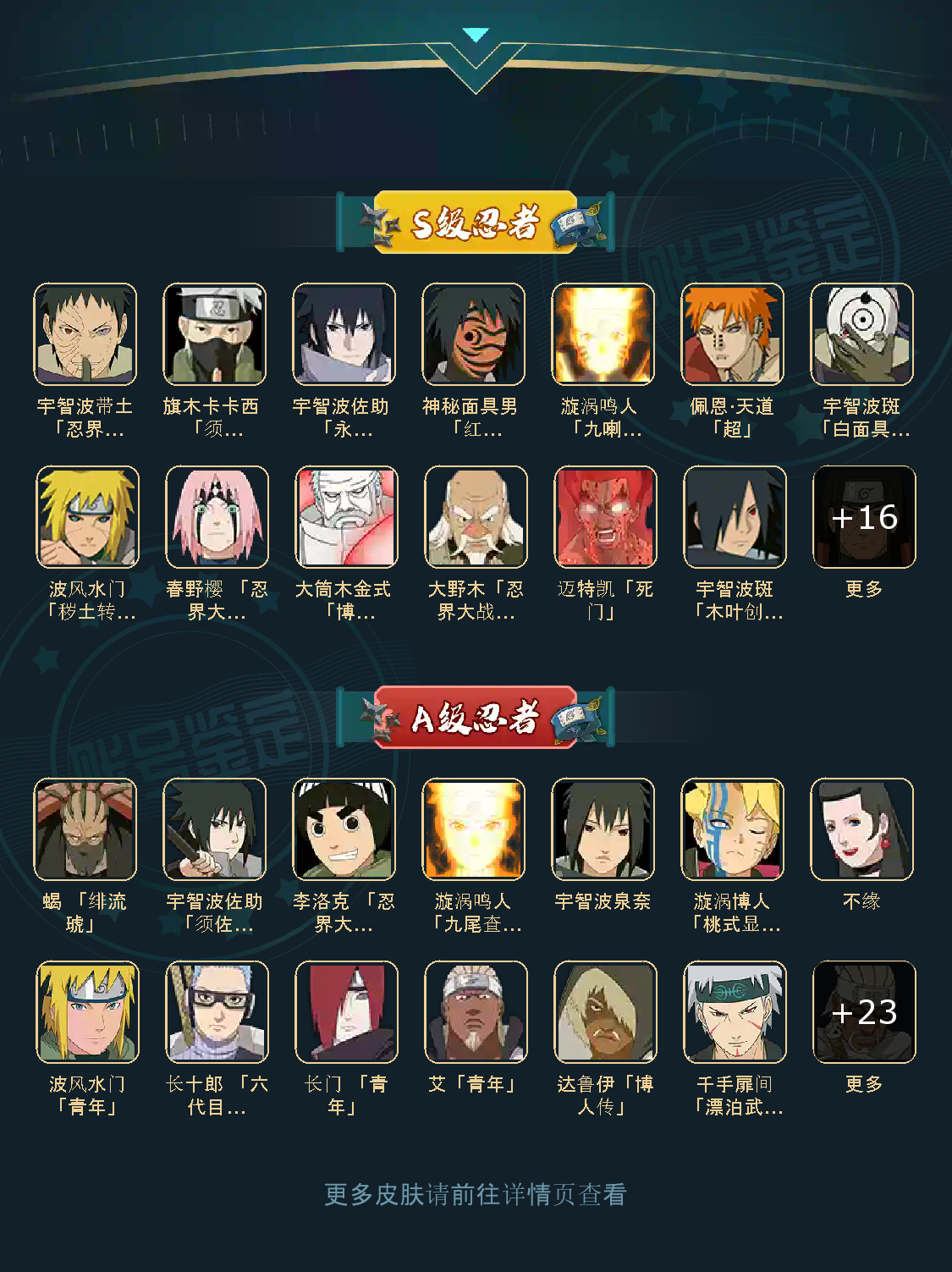 战力:1189W+;S忍26个;A忍29个,通灵兽19个,S忍:普通纲手九喇嘛鸣人永恒万花筒佐助忍战樱仙人自来也大蛇丸死门凯波风水门秽土水门豪杰自来也猿飞日斩秽土猿飞秽土柱间秽土斑木叶创立斑须佐鼬秽土鼬白面具忍战带土红夜面具男罗砂忍战大野木