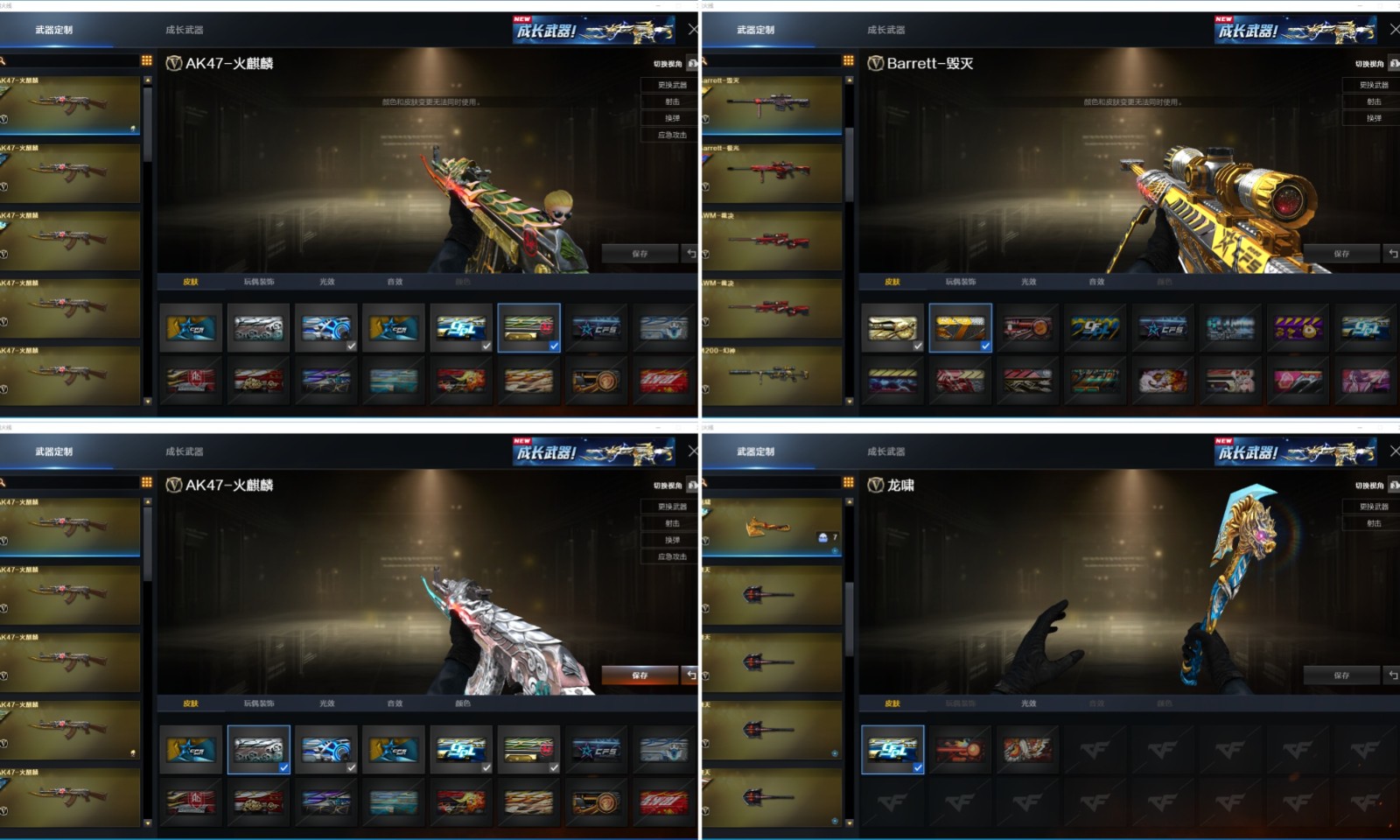 【重要光效】王者之击金色光效/王者之啸金色光效/AN94-超新星蓝色光效/加特林-炼狱蓝色光效/屠龙蓝色光效/巴雷特-毁灭蓝色光效/擎天蓝色光效/沙鹰-修罗蓝色光效/麒麟刺蓝色光效/龙啸蓝色光效/沙鹰-修罗蓝粉色光效/M4A1-玫瑰精灵红绿光效/M4A1-雷神红绿光效/王者之戮紫色光效/M4A1-黑骑士绿色光效/擎天绿色光效/龙啸绿色光效