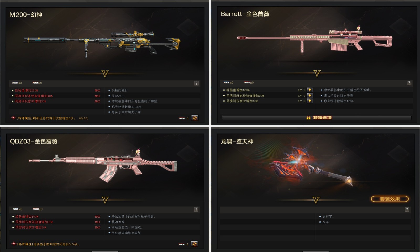 【英雄武器】_M200-幻神/Barrett-毁灭(9)/Barrett-极光/barrett-金色蔷薇(3)/AWM-天龙/AWM-裁决(2)/王者之力-觉醒版/M4A1-雷神(3)/M4A1-死神/M4A1-黑龙(2)/M4A1-龙血(3)/M4A1-千变/M4A1-黑骑士(7)/M4A1-武圣/M4A1-夜魔/M4A1-雷霆/M4A1-猎神/王者之戮-觉醒版/AK12-天启/AK47-火麒麟(8)/AK47-无影/AK47-黑鲨(3)/AK-47-猩红传说(7)/AK47-B-战士/AK47-B-战神/AN94-超新星(3)/QBZ03-金色蔷薇/超新星-悦享-觉醒版/王者之鲨-觉醒版/9A91-烈火(3)/RPK-盘龙(9)/汤姆逊-烈龙(6)/AA-12-雷霆(2)/加特林-炼狱(7)/COP-堕天神(2)/雷霆之契(2)/沙鹰-天神(4)/沙鹰-修罗(7)/沙鹰-幻兽/破空枪刃-夜魔/USP-雷暴/麒麟刺(8)/麒麟刺-堕天神/龙啸/龙啸-堕天神(2)/王者之啸-觉醒版/擎天(5)/王者之击-觉醒版/屠龙(2)/雷霆之锋/马来剑-夜魔/女皇利刃-幻兽/斩神刀-雷暴/高爆手雷-幻兽/高爆手雷-雷暴(3)/高爆手雷-雷霆(6)/高爆手雷-夜魔(5)/高爆手雷-堕天神(4)/烟雾弹-幻兽/烟雾弹-雷暴(3)/烟雾弹-雷霆(6)/烟雾弹-夜魔(5)/烟雾弹-堕天神(4)/闪光弹-幻兽/闪光弹-雷暴(3)/闪光弹-雷霆(6)/闪光弹-夜魔(5)/闪光弹-堕天神(4)