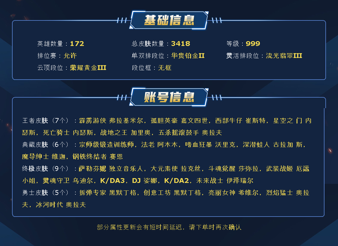 ~~喜欢记得收藏~~可排位~~2805皮全英雄丨1426原皮1379炫彩丨100神话/至臻/海克斯丨四色龙瞎/龙的传人丨IG套丨幻灵套丨鼠年套丨执事套丨虎年套丨DWG套丨KDA套丨青花瓷套丨海之歌套丨情人节套丨灵魂莲华套丨神龙尊者套丨斗魂觉醒套丨太空律动套丨破败军团套丨光明哨兵套丨女帝无双套丨水晶玫瑰套丨幽梦玫瑰套丨咖啡甜心套丨星之守护者套丨福牛守护者套丨青年瑞兹丨卧虎藏龙丨玉剑男女刀丨黑夜吸血鬼丨泳池女警佐伊丨斩星穿星创星御星~~租之前尽量查一下游戏ID,确保段位是您需要,避免浪费您的时间~~请勿挂机逃跑故意送人头,谢谢合作,谢谢~~