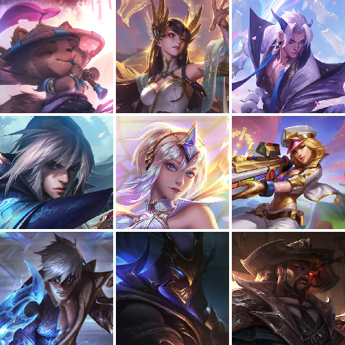 【重要皮肤】天龙之子伊泽瑞尔至臻 心之钢永恩至臻 墨之影武者亚索至臻 绝息圣堂厄运小姐至臻 剪纸仙灵希维尔至臻 青花瓷丽桑卓至臻 星之守护者辛德拉至臻 星之守护者艾克至臻 海之歌萨勒芬妮至臻 青花瓷拉克丝至臻 神凰行者烈羽焰凰霞至臻 女帝黛安娜至臻 战斗学院蕾欧娜至臻 太空律动璐璐至臻 未来战士卢锡安至臻 星之守护者索拉卡至臻 灵魂莲华提莫至臻 灵能特工伊泽瑞尔至臻 福牛守护者菲奥娜至臻 源计划逆流塞拉斯至臻 源计划阴劫至臻 神龙尊者炎龙瑟提至臻 黑夜使者凯隐至臻 征服者贾克斯至臻 KDA二代卡莎至臻 KDA阿卡丽至臻 电玩女神凯特琳至臻 电玩女神凯特琳2022至臻 绒毛菲兹至臻 绒毛菲兹2022至臻 玉剑传说武剑仙至臻 腥红之月亚托克斯至臻 腥红之月亚托克斯2022至臻 未来战士锤石至臻 未来战士锤石2022至臻 海克斯科技安妮 海克斯科技瑟庄妮 海克斯科技吉格斯 海克斯科技阿木木 海克斯科技魔腾 新卧虎藏龙贾克斯 水晶掠夺者卡兹克 黎明使者卡尔玛 恐惧新星德莱厄斯 零之枪骑赫卡里姆 摄魂使者薇恩 胜利女神娑娜 胜利巨口克格莫 荣誉使者玛尔扎哈 电玩勇者锐雯 星之守护者伊泽瑞尔 玉剑传说无影 玉剑传说舞剑仙 神凰行者烈羽焰凰霞 玉剑传说无劫 星之守护者佐伊 天龙之子斯莫德 替父从军花木兰 北辰之威内瑟斯 美猴王孙悟空 玉净夜叉凯特琳 紫金罗刹莫甘娜 广寒仙子嫦娥 虎痴之拳蔚 张辽文远 金猪烈焰瑟庄妮 胜利女神瑟庄妮 胜利之树茂凯 胜利机器人布里茨 胜利枪神格雷福斯 胜利枪神卢锡安 水晶玫瑰阿克尚 幽梦玫瑰伊莉丝 水晶玫瑰婕拉 冰雪驯鹿波比 持胡萝卜的雪人易 冰雪女神辛德拉 魄罗骑士瑟庄妮 平安夜女神娑娜 死亡誓约卡特琳娜 灵魂收割者索拉卡 海之歌奈德丽 泳池派对凯特琳 泳池派对佐伊 泳池派对普朗克 泳池派对奥莉安娜 泳池派对黑默丁格 泳池派对塔莉垭 泳池派对塔里克 泳池派对雷克顿 FPX普朗克 FPX墨菲特 SSG塔莉垭 SSG嘉文四世 SSG伊泽瑞尔 SKTT1阿兹尔 SKTT1伊莉丝 SSW雷恩加尔 SSW辛吉德 暗杀星奥莉安娜 暗杀星蒙多 暗杀星慎 Fnatic迦娜 Fnatic嘉文四世 冰雪节辛吉德 防暴士兵辛吉德 防暴天使凯尔 钢铁之翼艾尼维亚 冠军典狱长锤石 冠军之隐劫 警用试作体K9内瑟斯 蓝色忧郁崔斯特 南瓜头费德提克 圣诞精灵崔丝塔娜 卧虎藏龙贾克斯 无头骑士赫卡里姆 喜庆之树茂凯 幸福女神乐芙兰 雪装奈德丽 野兽猎人德莱文 野兽猎人泰达米尔 暗影沃里克 都铎王朝图奇 十五周年纪念希维尔 十周年纪念安妮 源代码乐芙兰 神凰行者瑞羽圣凰艾尼维亚 胜利凤凰艾尼维亚 大元素使拉克丝 绝息圣堂洛