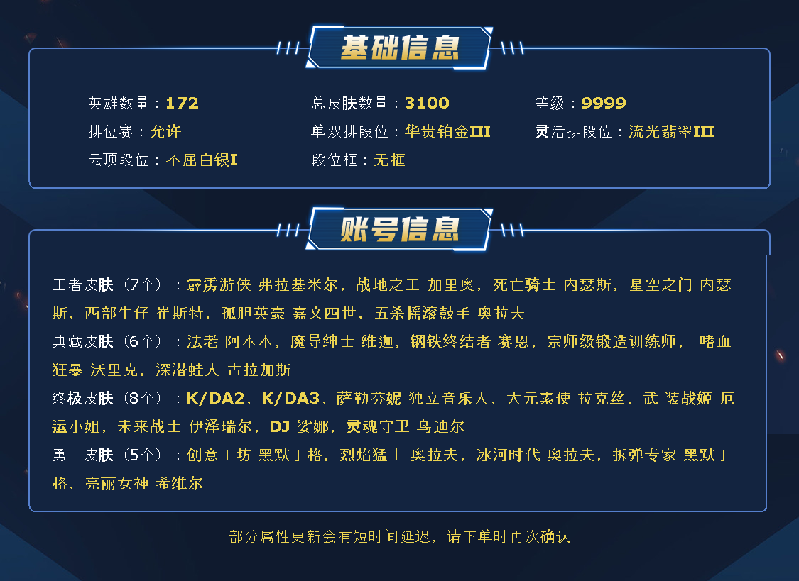 ~~喜欢记得收藏~~可排位~~2684皮全英雄丨1348原皮1336炫彩~~租之前尽量查一下游戏ID,确保段位是您需要的,避免浪费您的时间~~请勿挂机逃跑故意送人头,谢谢合作,谢谢~~