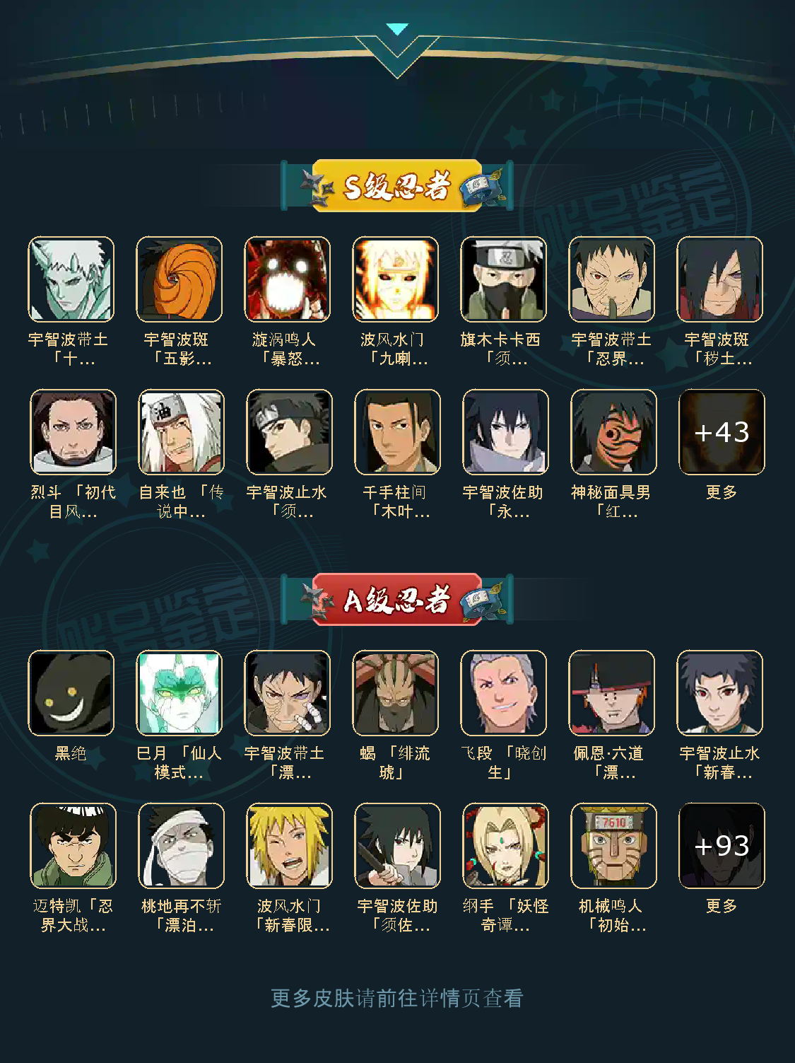 S级忍者(52个):,波风水门「九喇嘛连结」,自来也,舍人,旗木卡卡西「须佐能乎」,宇智波止水「须佐能乎」,艾「忍界大战」.大筒木桃式,宇智波斑「秽土转生•解」,千手柱间「木叶创立」,宇智波佐助「永恒万花筒」,神秘面具男「红夜之刃」,春野樱「忍界大战」,大简木金式「博人传」,流涡鸣人「九喇嘛连结」,三代目风影「秽士转生」,大野木「忍界大战」,迈特凯「死门」,宇智波斑「木叶创立」,宇智波带士「忍界大战」,千手柱间「秽士转生」,罗砂「四代目风影」,宇智波鼬「秽士转生」,自来也「舞之豪杰」,佩恩•天道「超」,药师兜「仙人模式」,宇智波斑「秽士转生」,艾「三代目雷影」,宇智波斑「白面具」,半藏「秽士转生」,千手扉间「秽士转生」,纲手「百豪」,无「二代目士影」,波风水门『秽士转生」,金角•银角「秽士转生」,猿飞日斩「秽土转生」,长门「秽士转生」,宇智波斑,千手柱间,艾「四代目雷影」,千手扉间,神秘面具男,鬼灯幻月「二代目水影」,佩恩「天道」,大蛇丸,波风水门,纲手,自来也,宇智波鼬「须佐能乎」,大野木「三代目士影」,自来也「仙人模式」,猿飞日斩