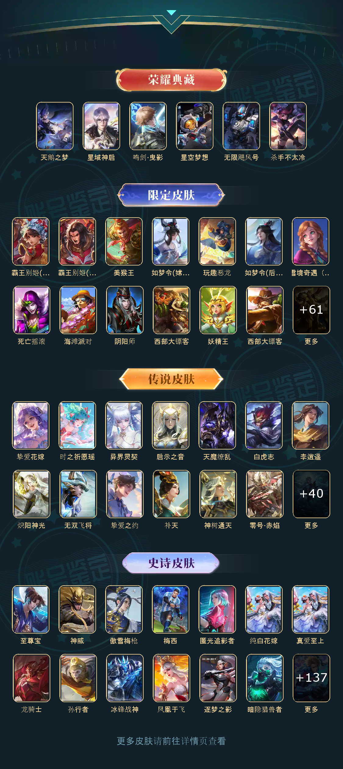 贵族等级V10,英雄数量123,典藏皮肤数6,皮肤数量434,天鹅之梦/杀手不太冷/星空梦想/无限飓风号/鸣剑·曳影/补天/启示之音