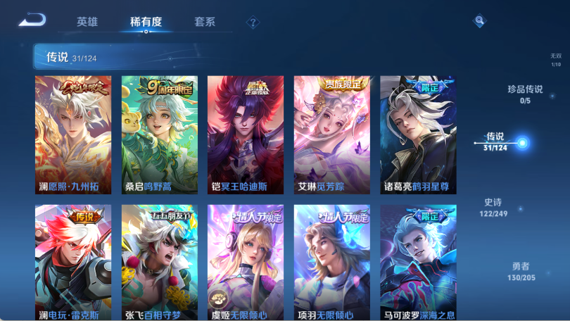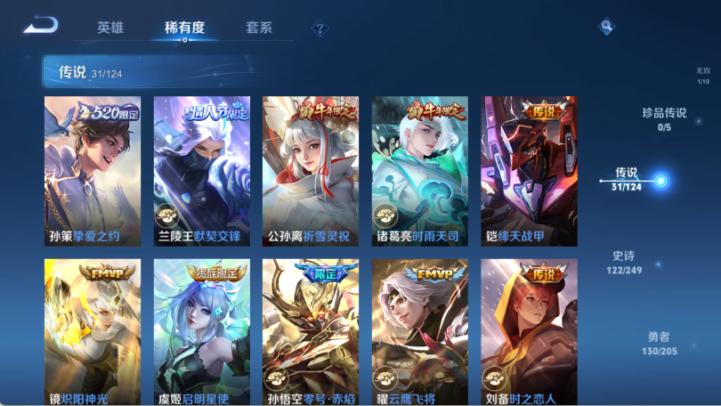 贵族等级V10,英雄数量124,典藏皮肤数6,皮肤数量383,