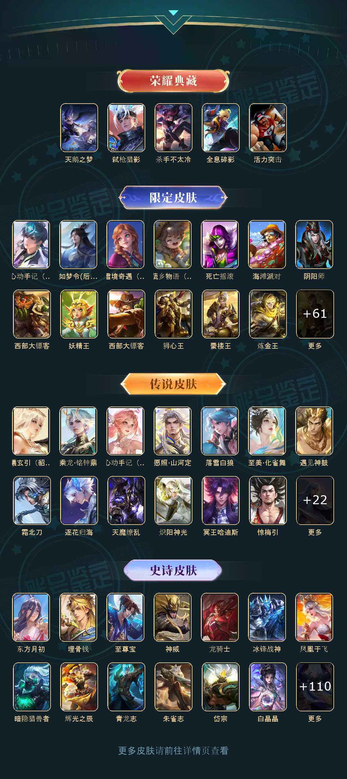 贵族等级V10,英雄数量124,典藏皮肤数5,皮肤数量409,