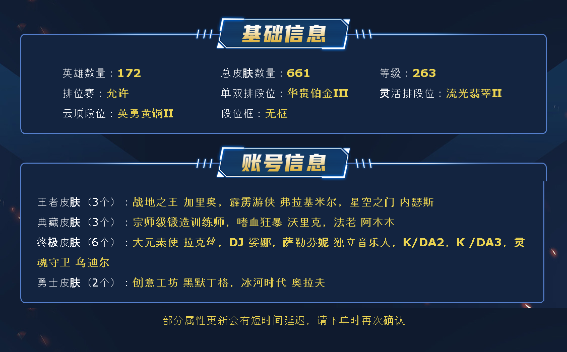 允许排位|圣堂铁男|天煞劫|iG卡莎|圣龙李青|4终极|1神话|47传说|166限定|66史诗|