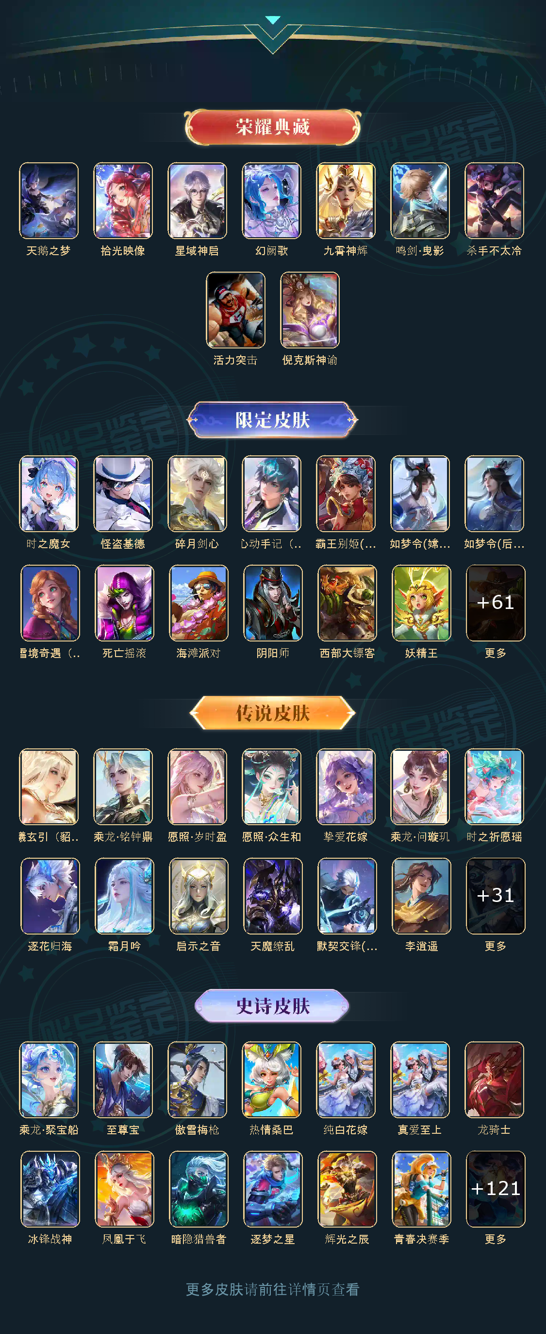 贵族等级V10,英雄数量124,典藏皮肤数8,皮肤数量414,天鹅之梦/活力突击/倪克斯神谕/鸣剑·曳影/星域神启