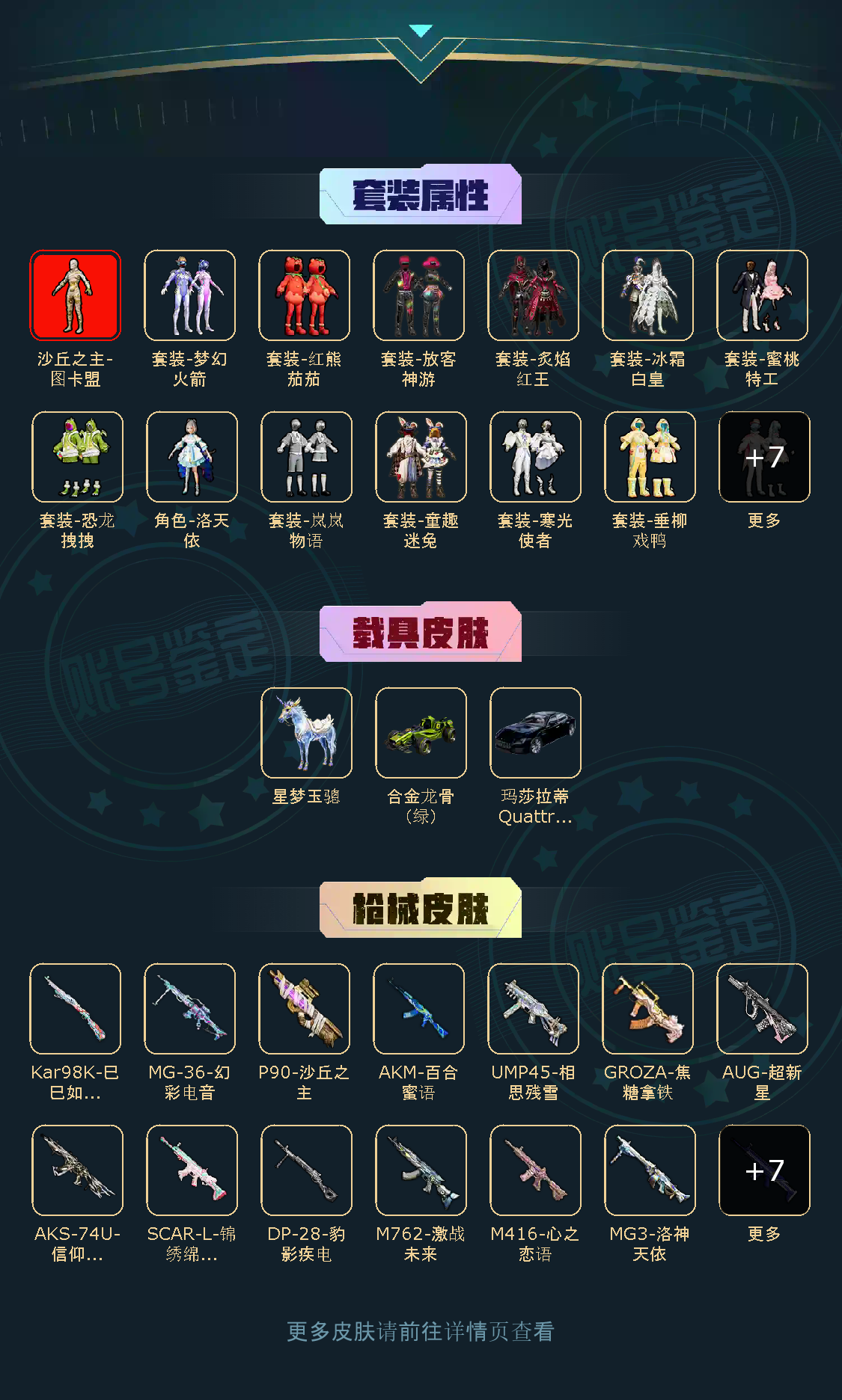 【稀有资产】沙丘之主-图卡盟[3级]/套装-奇异狩猎者/套装-粉红小猪/套装-浪漫天命/套装-雪山精英/套装-暗影哥特/套装-龟仙人/套装-糯粉咩咩/角色-粉雾星云/套装-红熊茄茄/角色-都市丽猫/角色-摩登魅猫/角色-2B战斗服款/套装-狂沙舞者/套装-牛仔情诗/套装-沙丘之歌/M416-仓鼠灰灰