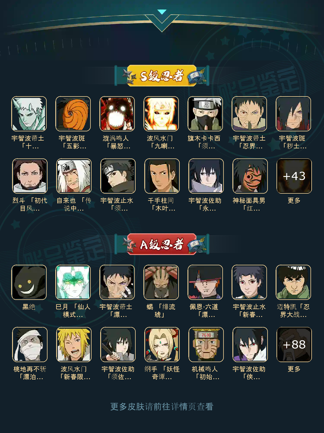 54S 98A 405忍者 宇智波带土「暴怒」/干柿鬼鲛「鲛肌融合」/宇智波几乎全忍者佐助「疾风传咒印」/迈特凯「忍界大战」/宇智波带土「忍界大战」/宇智波斑「木叶创立」/佩恩·天道「超」