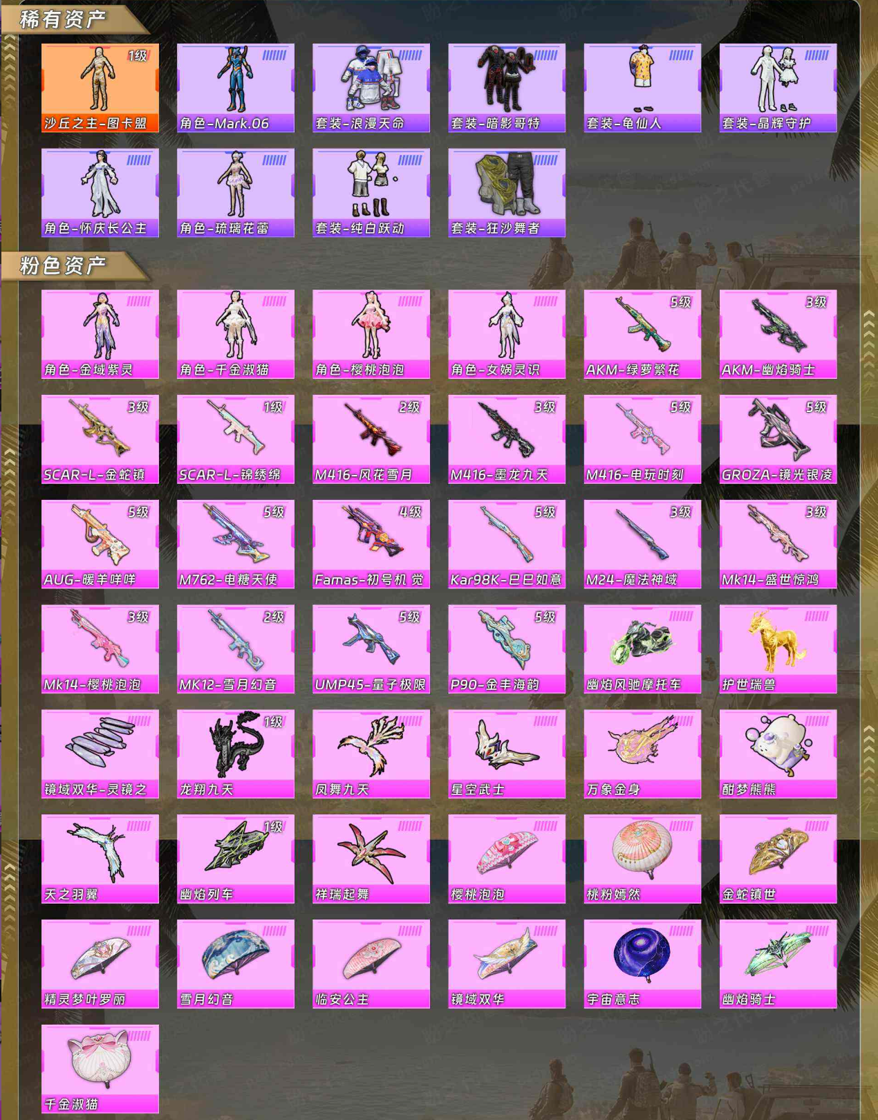 【粉色枪皮】AKM-绿萝繁花/AKM-幽焰骑士/SCAR-L-金蛇镇世/SCAR-L-锦绣绵绵/M416-风花雪月/M416-墨龙九天/M416-电玩时刻/GROZA-镜光银凌/AUG-暖羊咩咩/M762-电糖天使/Famas-初号机 觉醒Ver./Kar98K-巳巳如意/M24-魔法神域/Mk14-盛世惊鸿/Mk14-樱桃泡泡/MK12-雪月幻音/UMP45-量子极限/P90-金丰海韵