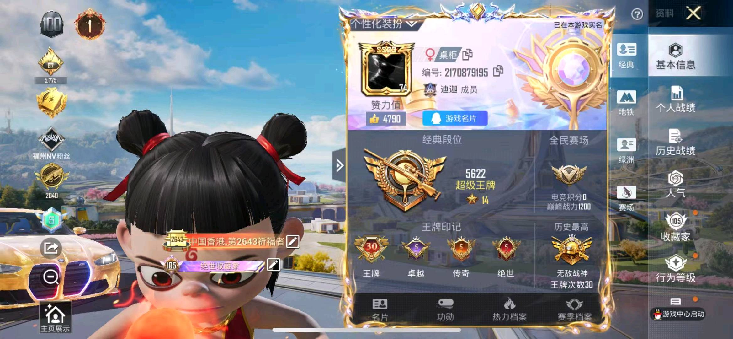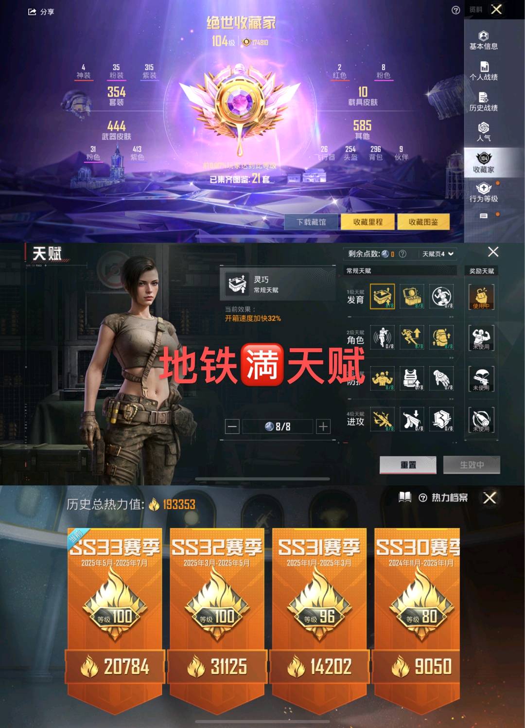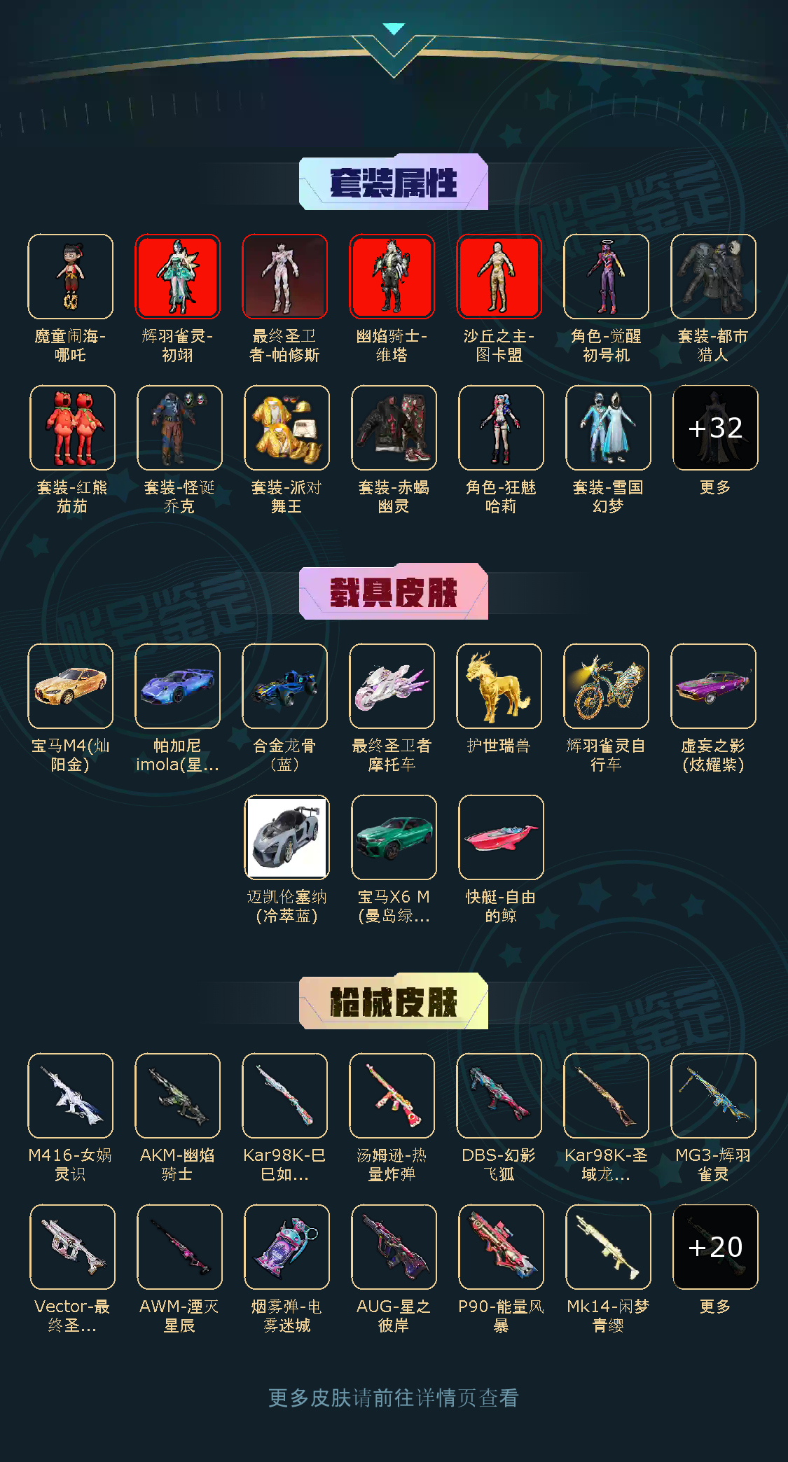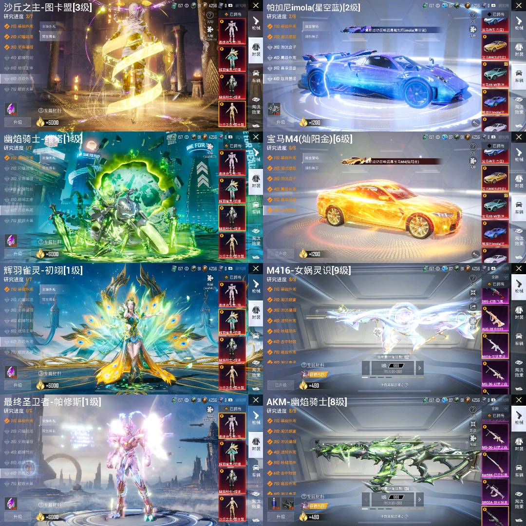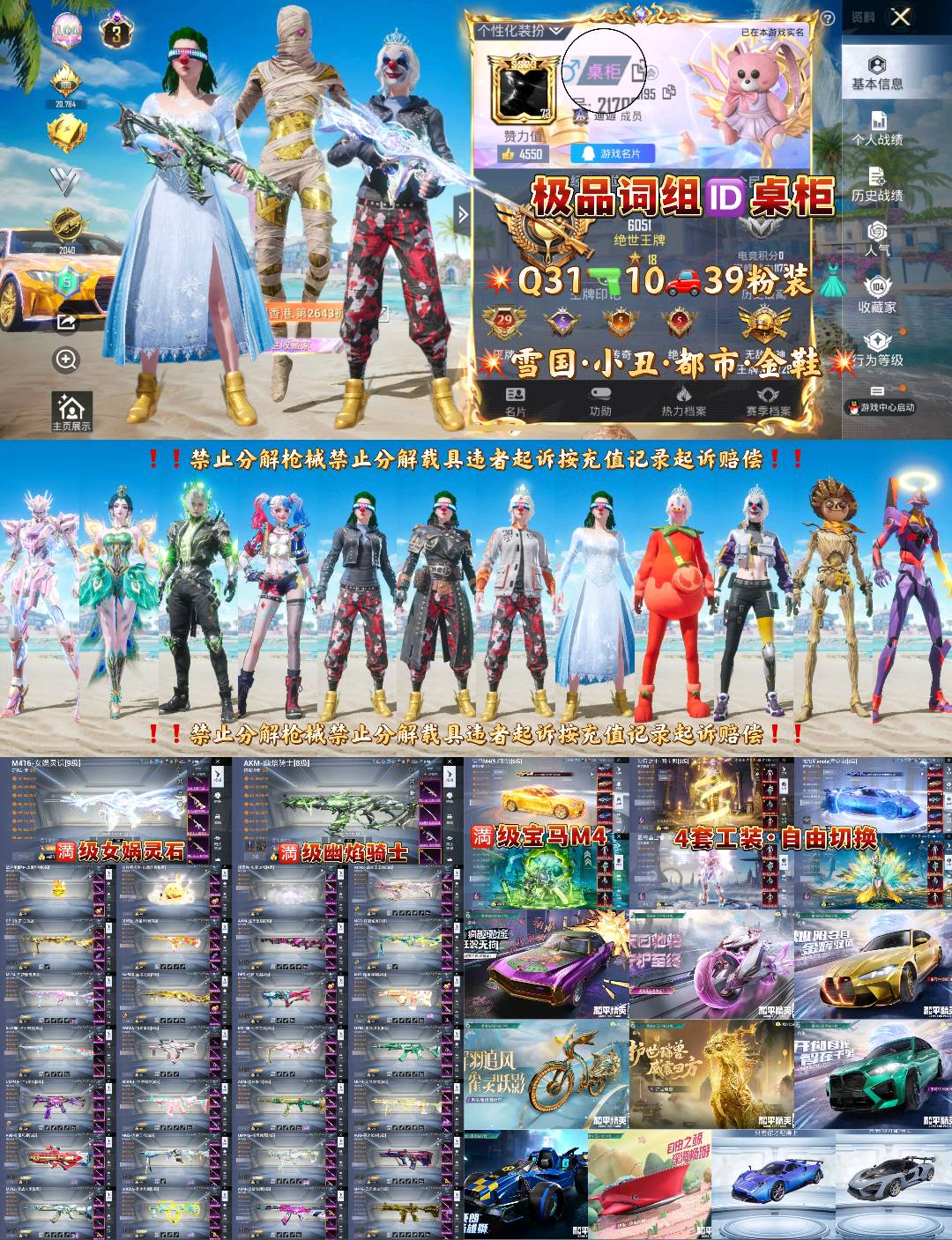 41粉,10载具,368套装,32王牌印记,无敌战神历史最高段,203929热力值 AKM-绿萝繁花/M416-电玩时刻/AUG-星之彼岸/M762-激战未来/GROZA-香水柠檬/AKM-幽焰骑士/M416-五爪金龙/M416-女娲灵识/AKM-炫紫旋律/M762-青锋波束/AUG-暖羊咩咩/SCAR-L-锦绣绵绵/GROZA-镜光银凌/SCAR-L-魔童闹海 哪吒/DBS-幻影飞狐/Mk14-闲梦青缨/Mk14-甜梦熊击/MG3-辉羽雀灵/MG-36-幻梦之森/DP-28-罗征/MG3-洛神天依/DP-28-豹影疾电/UMP45-量子极限/P90-能量风暴/UMP45-宇宙意志/汤姆逊-热量炸弹/Vector-最终圣卫者/UMP45-相思残雪/烟雾弹-电雾迷城/破片手榴弹-热量炸弹/Kar98K-圣域龙灵/Kar98K-巳巳如意/AWM-湮灭星辰/宝马M4(灿阳金)/虚妄之影(炫耀紫)/宝马X6 M(曼岛绿)/快艇-自由的鲸/合金龙骨(蓝)/迈凯伦塞纳(冷萃蓝)/帕加尼imola(星空蓝)/护世瑞兽/辉羽雀灵自行车/最终圣卫者摩托车/