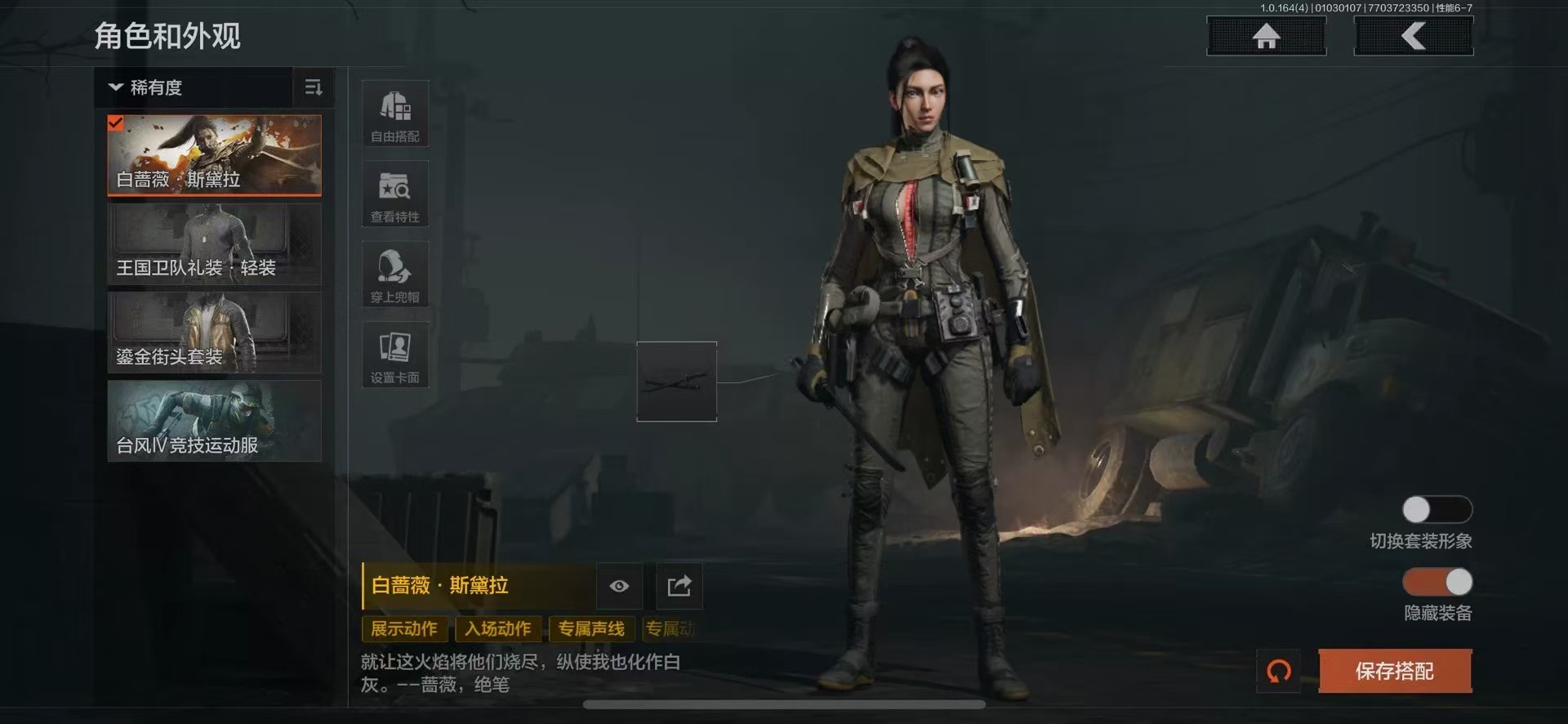 30级,历史最高段位:暗区传说【近战武器】:贝利亚黄昏,涂鸦利刃,胜利军刀,明刀绣春,精英指虎,工兵铲;【手套】:战术甲胄防护手套;【角色皮肤】:白蔷薇斯黛拉,台风Ⅳ竞技运动服,鎏金街头套装,王国卫队礼装轻装;【突击步枪】:火力倾泻AKM,德尔塔小队M4A1,黄金M4A1,巅峰M4A1,秋宴FAL,战术大师FAL,真实之眼FAL,竞技MDR,逆火MDR,棱光裂变AK102,棱光裂变AK74N,山地伪装AK74N,坚守AKS74U,火力倾泻AUG,极恶AUG,炎夏浪花AR57,水果AR57,轰炸小子ACE31,胜利锋刃AEK,暴虐AEK,旗帜AEK,绿松石数码Groza,绿松石数码T951,林地数码T03,深潜T03,绿松石数码9A91;【冲锋枪】:火力倾泻MP5,龙威MP5,炎夏浪花MP5,激流MPX,涂鸦MPX,星云火花P90,香蕉UMP45,苏梅克UMP45,香蕉MP40,多边棱彩MAC10,镀铬寒铁T79,沙色Vector45,绿松石数码T85,恶念Vector9,山地伪装Vector9,危险地带Suomi,龙影Suomi;【射手步枪】:旗帜SVDS,山地伪装MK14,黑金国际M110,竞技M110,绿松石数码DBR,绿松石数码QBU191;【栓动步枪】轰炸小子AX50,城市数码SJ16,绿松石数码SJ16,莫克斯M24;【轻机枪】:旗帜RPK16,娜迦RPK16,战术大师RPK16,火力倾泻RPD,多边棱彩M249;【霰弹枪】:多边棱彩M870,胜利锋刃S12K,深水浴池USAS12,营房暖冬USAS12,桔色USAS12,真实之眼APR310,现代化APR310;【卡宾枪】:绿松石数码SKS;【手枪】:过江龙G18C,涂鸦G18C,绿松石数码沙漠之鹰,香蕉沙漠之鹰,白貂F57;