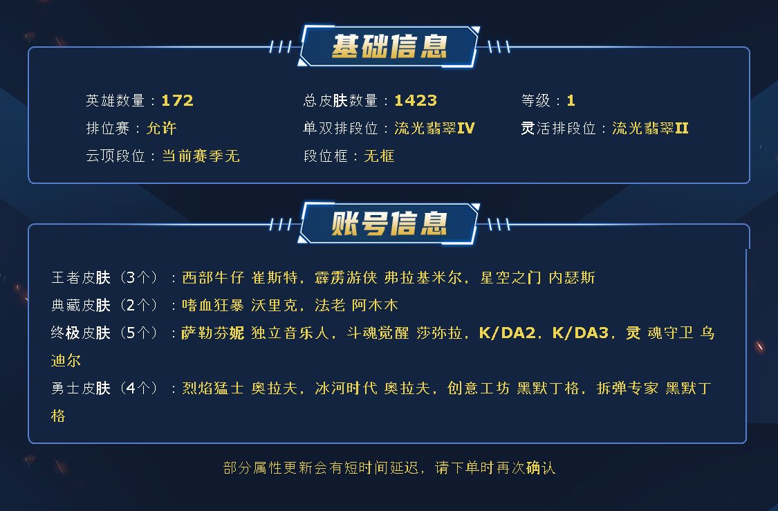 ~~喜欢记得收藏~~可排位~~1300皮全英雄~~租之前尽量查一下游戏ID,确保段位是您需要的,避免浪费您的时间~~请勿挂机逃跑故意送人头,谢谢合作,谢谢~~