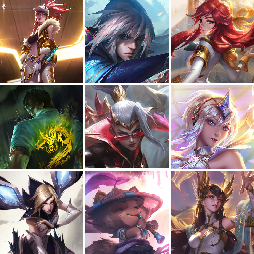 【重要头像】御星魔矢艾希 萨勒芬妮超级巨星 萨勒芬妮独立音乐人 我麦是开的么 泳池派对凯特琳 击拳 灵魂莲华阿狸 灵魂莲华莉莉娅 灵魂莲华卡西奥佩娅 披萨鸡 送披萨的小姐姐希维尔 至臻青花瓷拉克丝 至臻魅惑女巫莫甘娜 至臻魔女乐芙兰 至臻太空律动璐璐 至臻战斗学院蕾欧娜 至臻女帝黛安娜 至臻星之守护者索拉卡 至臻KDA卡莎 至臻奥术师佐伊 至臻魔女婕拉