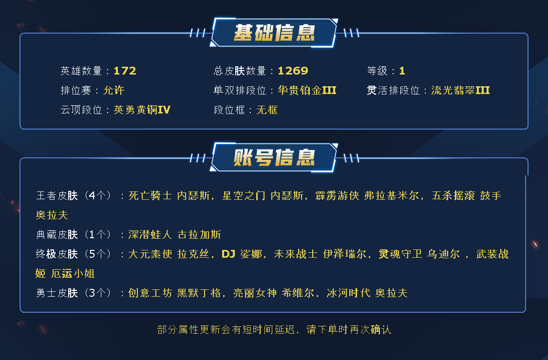 ~~喜欢记得收藏~~可排位~~1119皮全英雄~~租之前尽量查一下游戏ID,确保段位是您需要的,避免浪费您的时间~~请勿挂机逃跑故意送人头,谢谢合作,谢谢~~