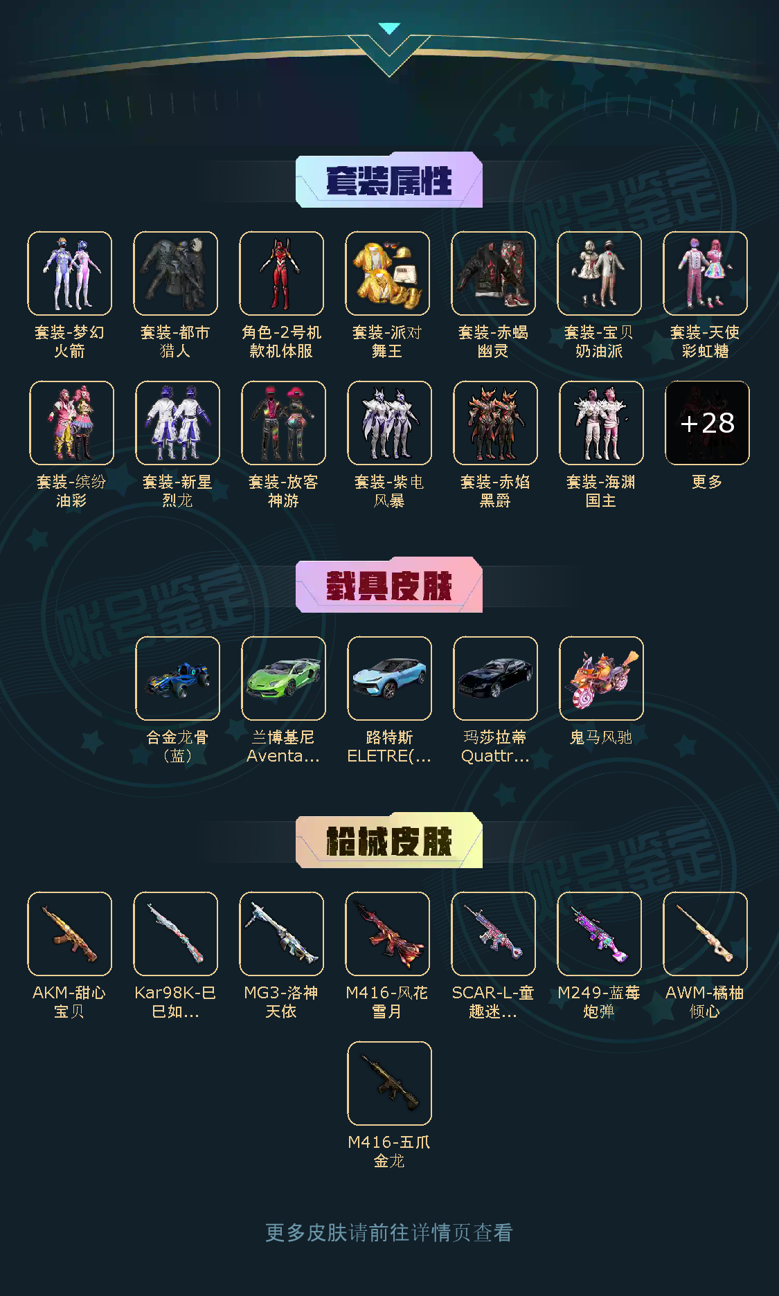 【稀有资产】角色-2号机款机体服/套装-彩虹甜喵/套装-缤纷油彩/AKM-甜心宝贝/M416-五爪金龙/M416-风花雪月/角色-8号机/角色-Mark.06/角色-明日香款战斗服/角色-零款战斗服/套装-派对舞王/套装-深海小丑鱼/套装-赤蝎幽灵/套装-都市猎人/套装-奇异狩猎者/套装-胖达圆圆/套装-浪漫天命/套装-暗影哥特/套装-迅捷狂鲨/套装-恶魔人蛛/套装-狂沙舞者/套装-冷酷挑战者