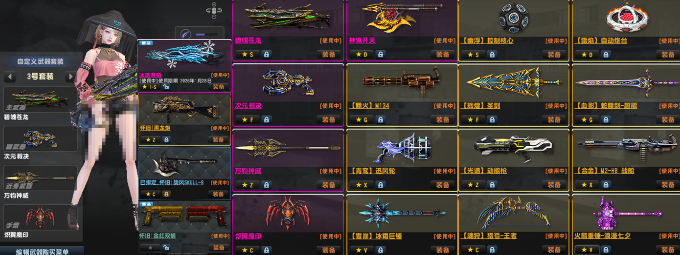 3.期限冰璃寒蟒万钧神威,到1月28号。怀旧三件套黑龙炮,斧头,金红双蝎!闪电MK3A1汽锤,重炮光束MK1和2,维京全套(联动星梦炽焰),6攻闪电野牛Bizon!(联动十五),幽浮无人机(联动管家和伯爵)冰锤(联动金火星)!强化配件武器(见图4),强化武器全满,主要配件武器全部6攻,其他最少5阶。已去黑雾!
