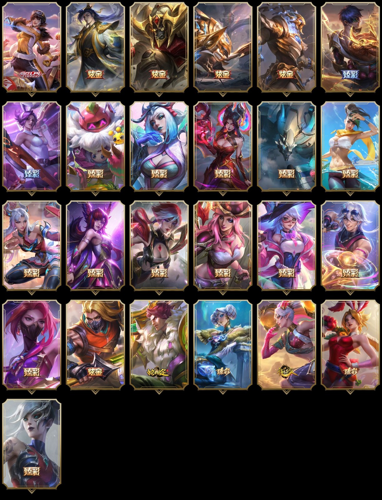 【传说皮肤】光明哨兵格雷福斯 神龙尊者夜月幻龙亚索 偶像歌手阿狸 女主播迦娜 灵能特工娑娜 灵魂莲华锤石 战斗学院伊泽瑞尔 绅士科加斯 冰霜之刃艾瑞莉娅 神王盖伦 蔷薇绅士杰斯 黑夜使者亚索 真实伤害艾克 炼狱魔犬内瑟斯 双重冰晶艾尼维亚 焰尾妖狐阿狸 冰霜亚龙希瓦娜 源计划泯灭雷克顿 灵魂莲华瑟提 未来战士凯特琳 腥红之月鬼武姬阿卡丽 黎明使者索拉卡 大天使长米迦勒凯尔 灌篮高手德莱厄斯 暗星锤石 银河魔装机神兰博 神拳李青 西部魔影卢锡安 黯黑魔龙希瓦娜 铁哥们儿奥拉夫 源计划超体莫德凯撒 月蚀骑士蕾欧娜 霸天零式赛恩 神王德莱厄斯 钢铁之翼凯尔 战地巨兽科加斯 电玩女神娑娜 战场女武神凯尔 钢铁军团盖伦 源计划净化薇恩 奥德赛凯隐 合金巨兽努努和威朗普 霸天异形卡兹克 第三类接触黑默丁格 地狱行者孙悟空 暗星女王拉克丝 地狱之门卫士加里奥 枯萎之壤泽拉斯 天煞劫 提莫约德尔人的一大步 星之守护者霞 源计划联合艾希 魔幻卡牌崔斯特 最终BOSS维迦 灵魂莲华阿狸 源计划毁灭派克 神龙尊者昼日真龙亚索 邪鸦魅影乐芙兰 冰川巨兽墨菲特 烈焰雄心崔丝塔娜 欧米伽小队幽灵特工 源计划林易 西部魔影大小姐蕾欧娜 恶魔男爵瑞兹 星之守护者洛 星之守护者金克丝 战斗学院凯特琳 神龙尊者圣龙李青 上古战魂魔腾 宇航员诺提勒斯 西部天使艾希 西部魔影永恩
