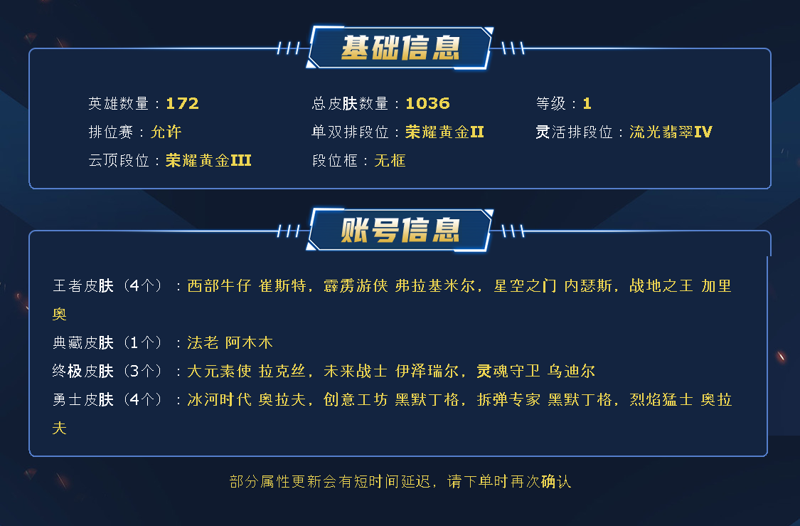 ~~喜欢记得收藏~~可排位~~1036皮全英雄~~租之前尽量查一下游戏ID,确保段位是您需要的,避免浪费您的时间~~请勿挂机逃跑故意送人头,谢谢合作,谢谢~~