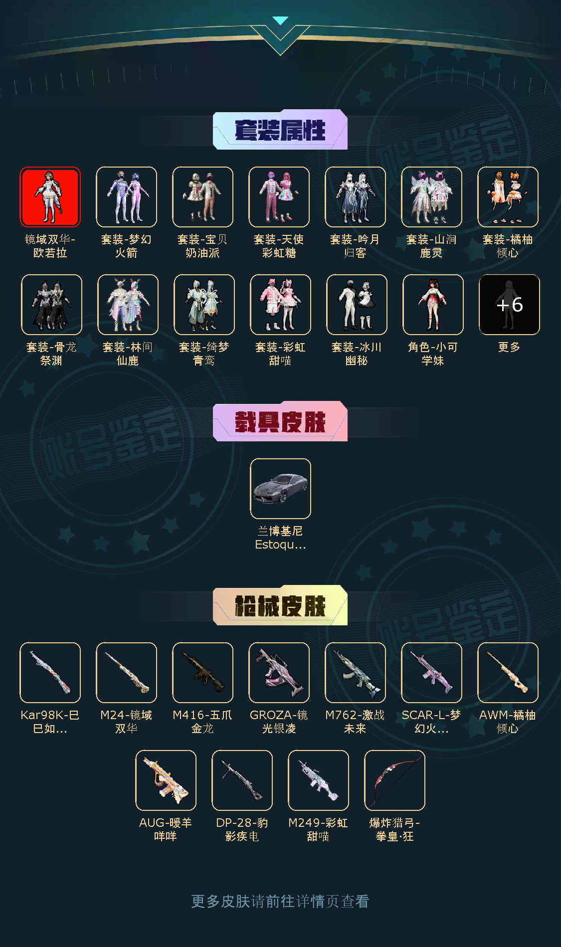 【稀有资产】镜域双华-欧若拉[3级]/套装-彩虹甜喵/角色-严莉莉/M416-五爪金龙/SCAR-L-梦幻火箭/AUG-暖羊咩咩/角色-8号机/角色-Mark.06/套装-粉红小猪/套装-浪漫天命/套装-暗影哥特/套装-龟仙人/套装-浪漫波比/套装-狂沙舞者/套装-青涩年华/角色-绊爱/角色-都市丽猫/角色-2B战斗服款/角色-海琴烟
