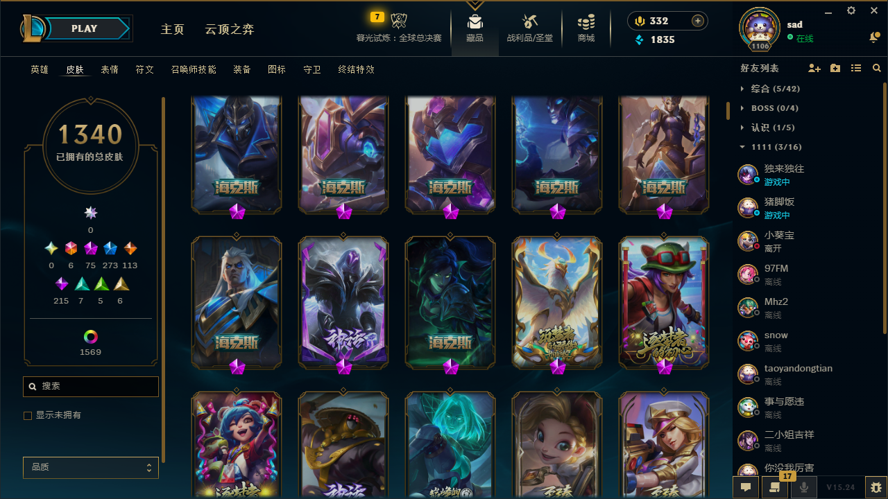 【重要皮肤】灵魂莲华拉克丝至臻 人工智能悠米至臻 神龙尊者比翼之龙洛至臻 魔女阿卡丽至臻 魂蔷薇烈娜塔至臻 玉剑传说琴仙子至臻 斗魂觉醒萨科至臻 绝息圣堂厄运小姐至臻 海珀利安小队X09星环灵风迦娜至臻 星之守护者辛德拉至臻 海之歌萨勒芬妮至臻 西部魔影猎天使恶魔泰隆至臻 幻灵战斗猫金克丝至臻 青花瓷拉克丝至臻 神凰行者烈羽焰凰霞至臻 魅惑女巫莫甘娜至臻 战斗学院蕾欧娜至臻 太空律动璐璐至臻 魔女婕拉至臻 魔女乐芙兰至臻 奥术师佐伊至臻 未来战士卢锡安至臻 真实伤害赛娜至臻 星之守护者索拉卡至臻 灵魂莲华提莫至臻 灵能特工伊泽瑞尔至臻 源计划逆流塞拉斯至臻 源计划阴劫至臻 黑夜使者凯隐至臻 焰执事布兰德至臻 KDA二代卡莎至臻 KDA一代卡莎至臻 KDA卡莎2022至臻 KDA阿狸至臻 KDA阿狸2022至臻 KDA伊芙琳至臻 KDA伊芙琳2022至臻 KDA阿卡丽至臻 KDA阿卡丽2022至臻 战斗学院拉克丝至臻 战斗学院拉克丝2022至臻 烈焰美人薇恩至臻 烈焰美人薇恩2022至臻 电玩女神凯特琳至臻 电玩女神凯特琳2022至臻 魅惑女巫厄运小姐至臻 魅惑女巫厄运小姐2022至臻 星之守护者妮蔻至臻 星之守护者妮蔻2022至臻 源计划正义艾瑞莉娅至臻 源计划正义艾瑞莉娅2022至臻 真实伤害奇亚娜至臻 真实伤害奇亚娜2022至臻 未来战士锤石至臻 未来战士锤石2022至臻 黑夜使者李青至臻 黑夜使者李青2022至臻 灰烬骑士派克 海克斯科技安妮 海克斯科技瑟庄妮 海克斯科技克格莫 海克斯科技斯维因 海克斯科技吉格斯 海克斯科技玛尔扎哈 海克斯科技嘉文四世 海克斯科技阿利斯塔 海克斯科技拉莫斯 海克斯科技崔丝塔娜 新卧虎藏龙贾克斯 摄魂使者薇恩 青年瑞兹 胜利女神娑娜 胜利女神希维尔 胜利之王泰达米尔 胜利巨口克格莫 哥特萝莉安妮 舞会公主安妮 战熊骑士瑟庄妮 创星之灵璐璐 钢铁军团拉克丝 荣誉使者玛尔扎哈 安妮梦游仙境 勇敢的心德莱厄斯 电玩女神厄运小姐 电玩勇者锐雯 电玩女神阿狸 星之守护者伊泽瑞尔 玉剑传说无影 玉剑传说舞剑仙 神凰行者幽羽玄凰萨勒芬妮 神凰行者烈羽焰凰霞 海珀利安小队Z01猎户座卢锡安 海珀利安小队Y03权天使卡蜜尔 玉剑传说舞龙卫 星之守护者佐伊 灵能特工易 龙的传人李青 银龙裁决泰隆 虎头虎脑崔丝塔娜 招财进宝提莫 替父从军花木兰 神龙烈焰金克丝 碧玉之牙卡西奥佩娅 古琴余韵娑娜 春晖神女拉克丝 你看见过我的熊猫吗安妮 北辰之威内瑟斯 南天之怒沃里克 美猴王孙悟空 定海神珍孙悟空 玉净夜叉凯特琳 广寒仙子嫦娥 虎痴之拳蔚 张辽文远 司马懿仲达 烈焰美人薇恩 纳财大帝塔姆 神龙之翼库奇 征服者贾克斯 福牛守护者安妮 福牛守护者厄斐琉斯 福牛守护者菲奥娜 胜利女神瑟庄妮 胜利之树茂凯 胜利机器人布里茨 胜利女神奥莉安娜 胜利枪神格雷福斯 胜利枪神卢锡安 胜利之剑亚托克斯 怦然心动凯特琳 水晶玫瑰迦娜 碎心之拳蔚 甜心之羽霞 甜心之翎洛 甜心宝贝安妮 甜心宝贝娑娜 穿心之剑菲奥娜 觅心游侠卢锡安 觅心魔灵奥莉安娜 觅心女王艾希 觅心之翼奎因 觅心萝莉金克丝 觅心猫猫悠米 觅心猎手薇恩 幽梦玫瑰辛德拉 幽梦玫瑰泰隆 水晶玫瑰婕拉 水晶玫瑰斯维因 北极星神黛安娜 北极星守望者佐伊 冬境仙灵索拉卡 寒冬精灵璐璐 冬季仙境奥莉安娜 雪球也能爆炸吉格斯 圣诞捣蛋鬼金克丝 圣诞老人布隆 圣诞老人德莱文 冰雪驯鹿波比 冰雪风暴希维尔 冬季仙境卡尔玛 持胡萝卜的雪人易 狂心冰王图奇 冰封王子蒙多 冰雪女神辛德拉 魄罗骑士瑟庄妮 夺命美人卡特琳娜 平安夜女神娑娜 圣诞糖果棒厄运小姐 魅惑女巫迦娜 魅惑女巫厄运小姐 魅惑女巫莫甘娜 魅惑女巫崔丝塔娜 魅惑女巫奈德丽 魅惑女巫伊莉丝 伯爵卡萨丁 大魔法锅布里茨 死亡誓约卡特琳娜 死亡誓约劫 死亡誓约维克托 灵魂收割者索拉卡 克烈古拉伯爵 小恶魔菲兹 南瓜头王子阿木木 海之歌艾希 海之歌奈德丽 海之歌萨勒芬妮 泳池派对凯特琳 泳池派对佐伊 泳池派对普朗克 泳池派对辛德拉 泳池派对奥莉安娜 泳池派对嘉文四世 泳池派对黑默丁格 泳池派对塔莉垭 泳池派对厄运小姐 泳池派对塔里克 泳池派对菲奥娜 泳池派对格雷福斯 泳池派对李青 泳池派对蕾欧娜 泳池派对雷克顿 泳池派对瑟提 泳池派对布隆 电玩战魂赫卡里姆 御星魔矢艾希 送披萨的小姐姐希维尔 鸡里奥 克格汪 制胜金靴李青 制胜金球拉莫斯 DRX凯特琳 EDG厄斐琉斯 EDG佛耶戈 EDG格雷福斯 EDG悠米 EDG佐伊 DWG崔斯特 DWG烬 DWG凯南 DWG蕾欧娜 DWG奈德丽 FPX锤石 FPX薇恩 FPX李青 FPX普朗克 FPX墨菲特 iG卡蜜尔 iG洛 iG卡莎 iG艾瑞莉娅 iG乐芙兰 iG菲奥娜 SSG霞 SSG洛 SSG纳尔 SSG塔莉垭 SSG嘉文四世 SSG伊泽瑞尔 SKTT1扎克 SKTT1烬 SKTT1辛德拉 SKTT1娜美 SKTT1艾克 SKTT1奥拉夫 SKTT1阿利斯塔 SKTT1卡莉丝塔 SKTT1瑞兹 SKTT1阿兹尔 SKTT1伊莉丝 SKTT1雷克顿 SSW锤石 SSW雷恩加尔 SSW泰隆 SSW图奇 SSW辛吉德 SKTT1贾克斯 SKTT1劫 SKTT1婕拉 SKTT1李青 SKTT1薇恩 暗杀星奥莉安娜 暗杀星蒙多 暗杀星努努和威朗普 暗杀星伊泽瑞尔 暗杀星慎 Fnatic迦娜 Fnatic库奇 Fnatic古拉加斯 Fnatic嘉文四世 Fnatic卡尔萨斯 冰雪节格雷福斯 冰雪节玛尔扎哈 冰雪节辛吉德 冰雪兽纳尔 防暴机器人布里茨 防暴士兵格雷福斯 防暴士兵辛吉德 防暴天使凯尔 钢铁之翼艾尼维亚 冠军典狱长锤石 冠军掠夺者卡兹克 冠军蔷薇乐