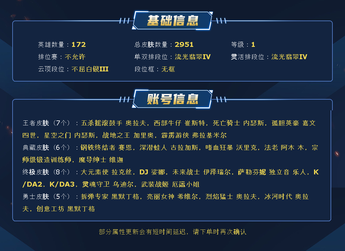~~喜欢记得收藏~~可排位~~2951皮全英雄丨1340原皮1611炫彩~~租之前尽量查一下游戏ID,确保段位是您需要的,避免浪费您的时间~~请勿挂机逃跑故意送人头,谢谢合作,谢谢~~