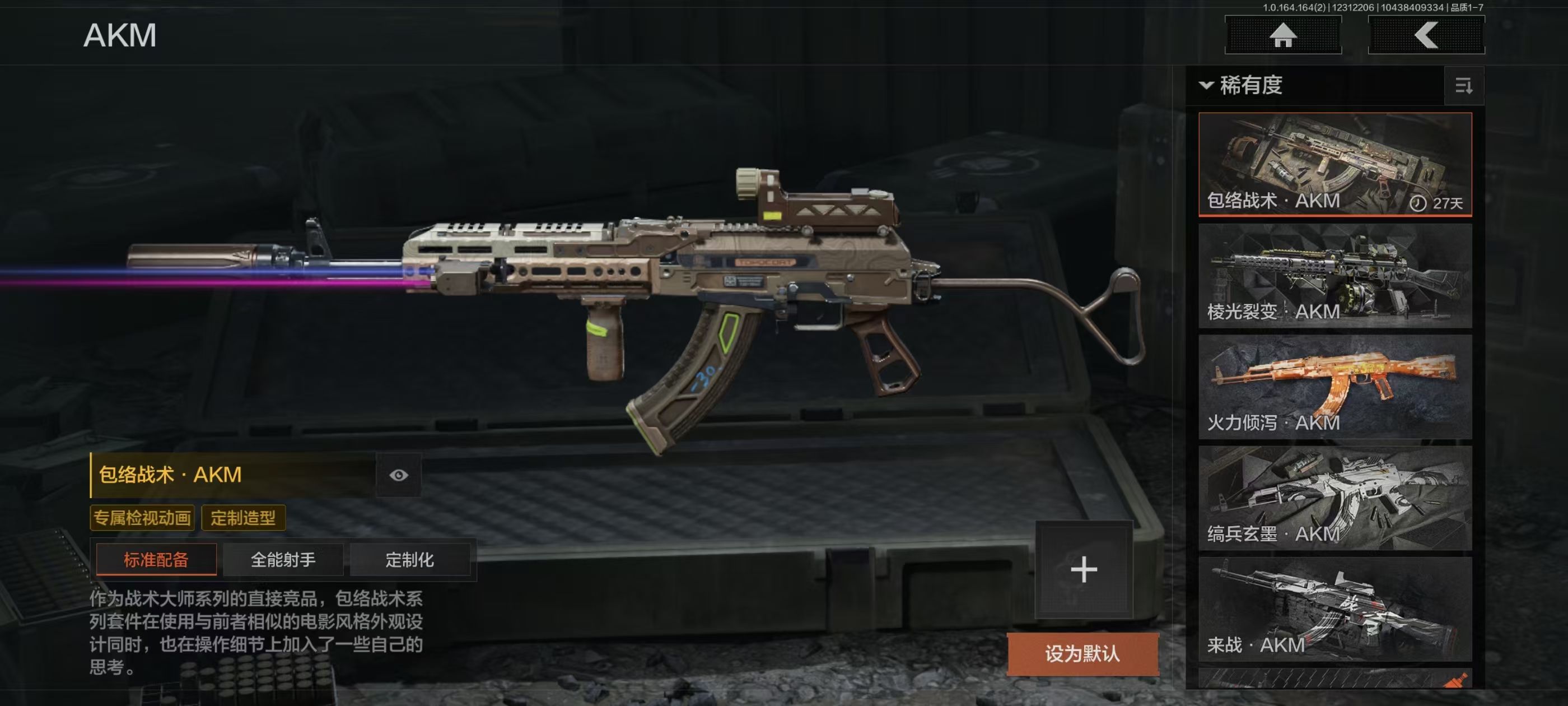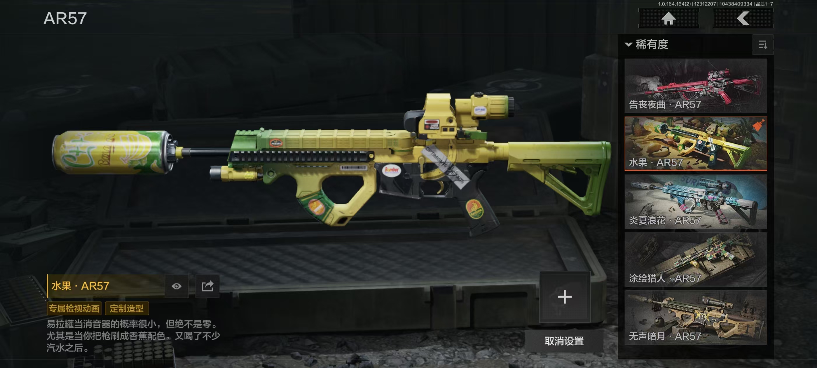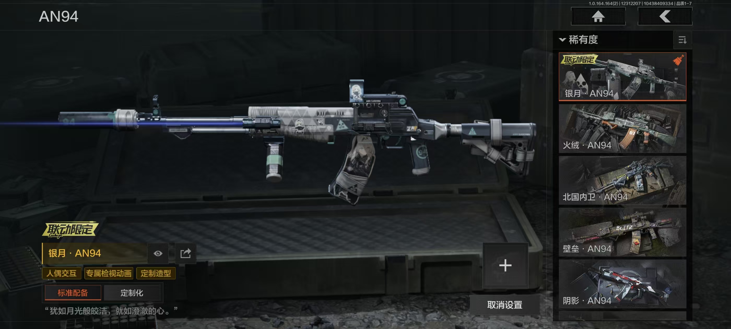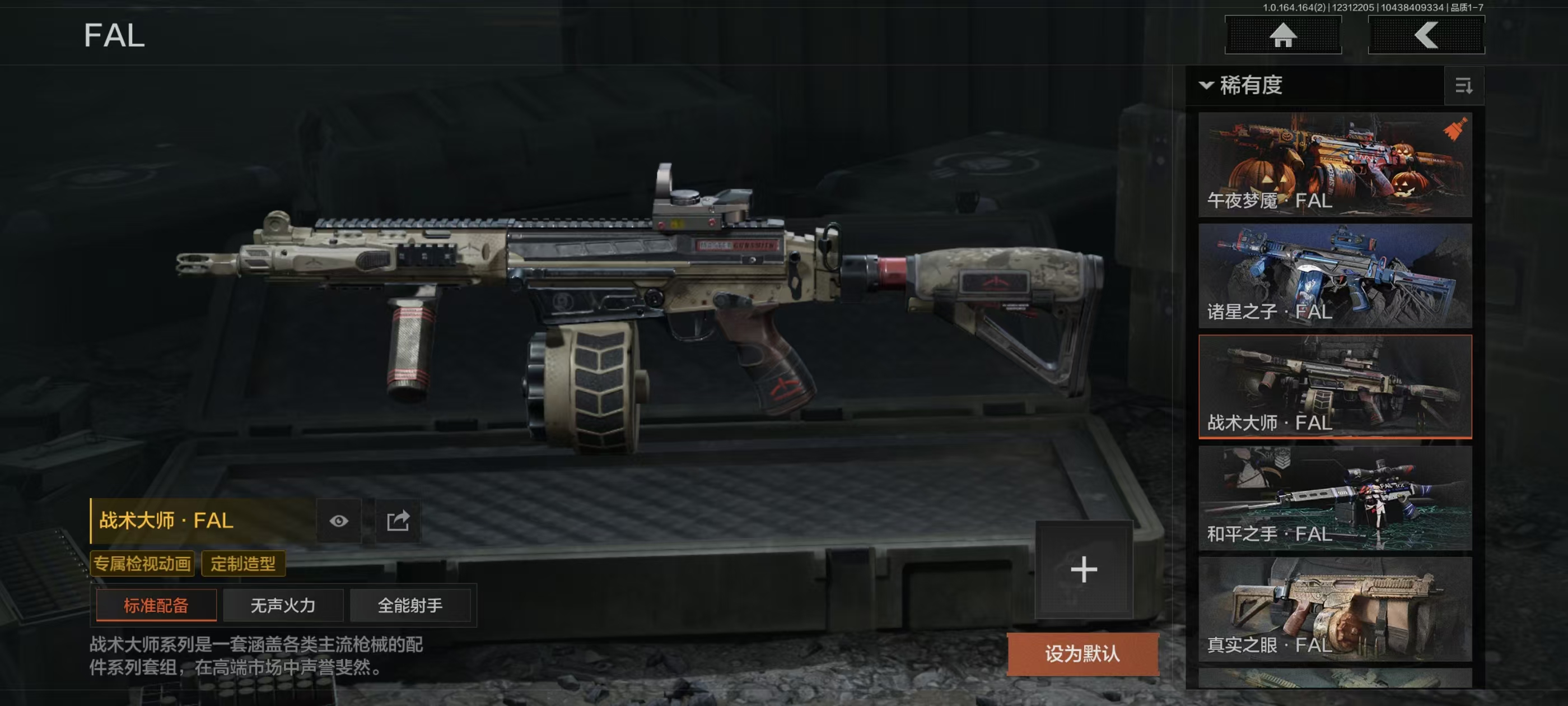 刀皮15,金枪皮20,近战武器:精英指虎,冬日冰镐,龙魂双节棍,明刀绣春,涂鸦利刃,胜利军刀,贝利亚黄昏,下弦月,旧日主宰,寒牙手刺,三尺万仞战术剑,瀚星斩铁,热能武器补牢,赢家匕首,收割者;手套:噤声者作战手套,玉鸾挂枝手套,战术甲胄防护手套;角色套装:使徒欧瑞恩,火绒塔莉娅,危崖魅影作战服,都护铁衣战术甲胄,黑暗行者特摄戏服,正义战士特摄戏服,噤声者吉利服,钢铁壁垒作战服,不败坚守作战服,龙魂武术运动服,战术甲胄,万众狂欢套装,枪皮:午夜梦魇FAL,诸星之子FAL,战术大师FAL,蓝色咆哮H416,堕落者H416,竞技H416,告丧夜曲AUG,水果AR57,告丧夜曲AR57,旗帜AEK,银月AN94,冬夜AK12,钢铁真理QBZ191,浮鳞影青QBZ192,利齿风暴MPX ,骑士之剑VSS,冰河碎影MK14,棱光裂变QBU191,长缨风掣RPK16;
