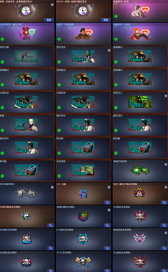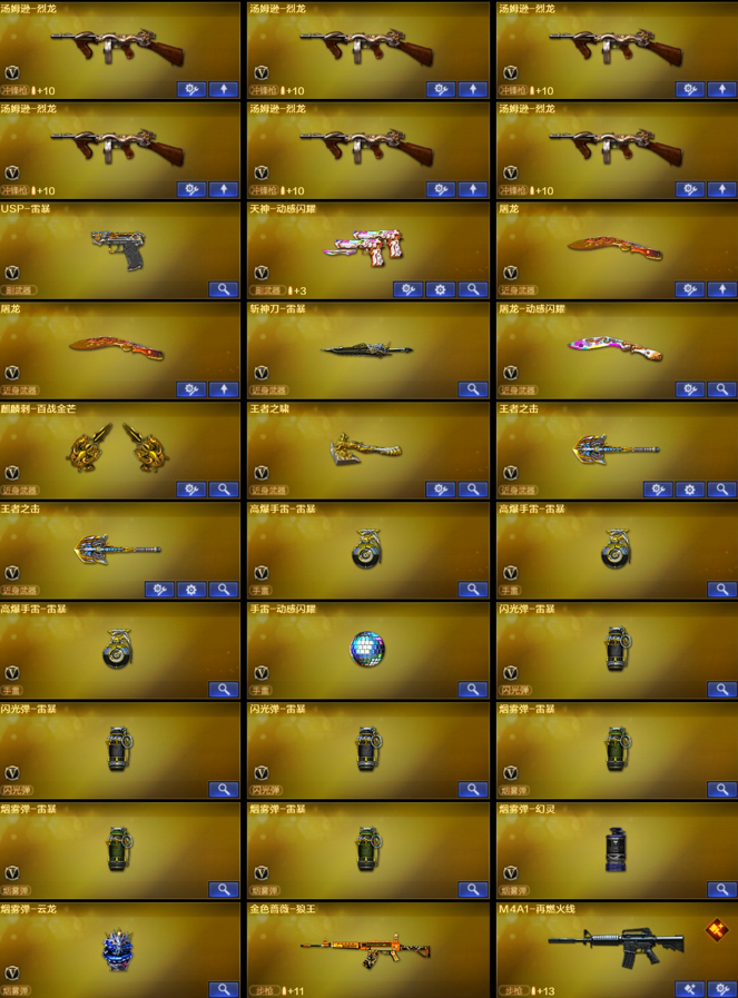【稀有武器】:USP-雷暴/天神-动感闪耀/QBZ03-金色蔷薇/AK47-火麒麟/M4A1-雷神/M4A1-黑骑士/白虎-电玩蓝兔/Barrett-毁灭/M200-竞技荣光/RPK-盘龙(5)/加特林-炼狱/炼狱-风暴/汤姆逊-烈龙(6)/斩神刀-雷暴