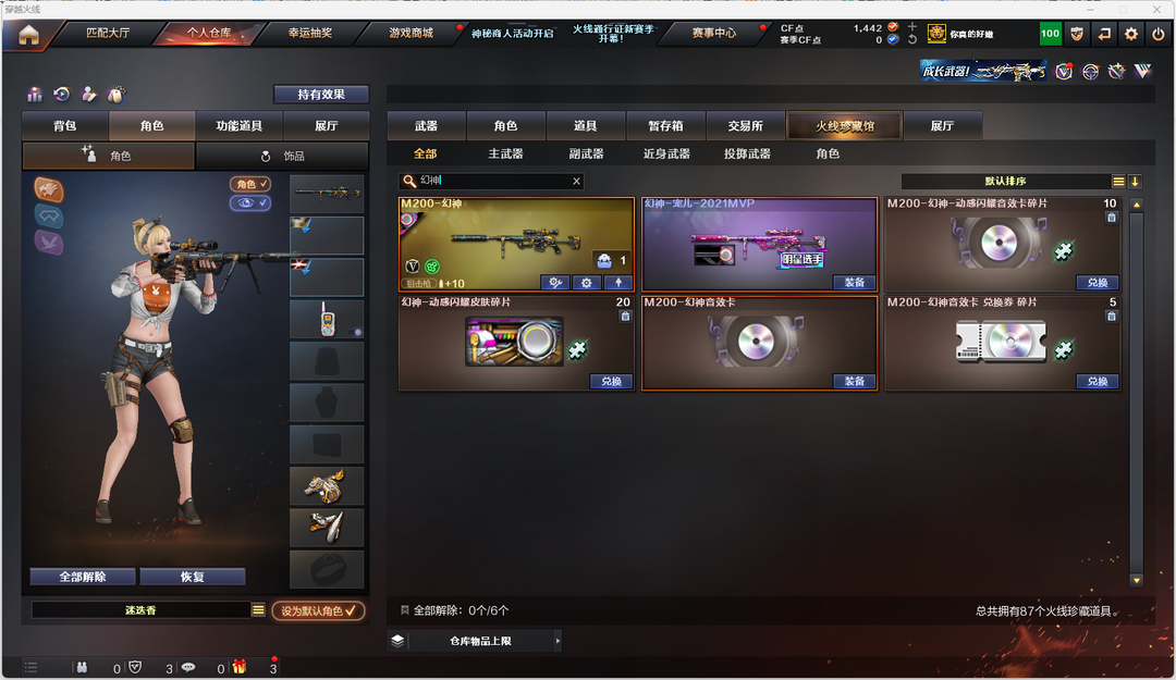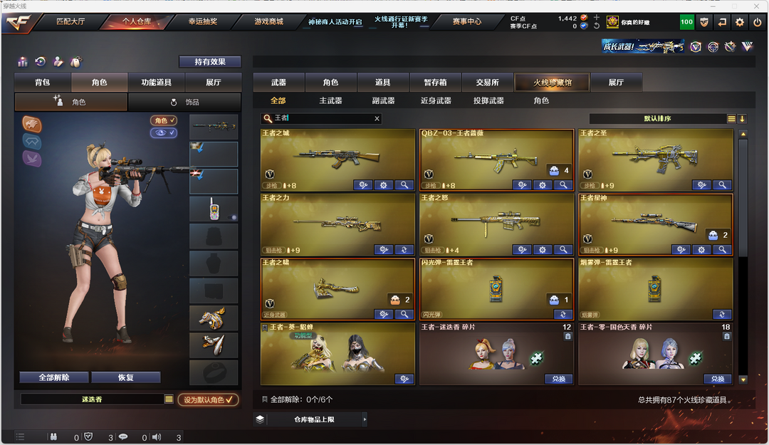 本游戏账号:英雄武器78个; 王者武器13个。 装备不多,但是主武器、副武器、近身武器够用 拥有完美游戏体验。重要的是,特殊装备有:AK47-火麒麟、M200-幻神、HK417-朱雀、M4A1-雷神、Barrett-毁灭、M4A1-黑骑士、加特林-炼狱、麒麟刺、M4A1-玫瑰精灵、M4A1-黑龙、烟雾弹-雷霆王者、闪光弹-雷霆王者、QBZ-03-王者蔷薇-觉醒版、王者之怒-觉醒版、王者之力、炫金雷神、炫金毁灭、迷迭香、潘多拉、雷霆-β、堕天使、王者-葵-貂蝉、炽天使、圣诞潘多拉-X、生化弹匣、M200-幻神音效卡、炼狱-悦蓝金色光效、Barrett-极光音效卡、王者之啸金色光效、AK47-火麒麟音效卡、M4A1-黑骑士音效卡、M4A1-雷神音效卡、Barrett-毁灭音效卡、等,随意畅选。