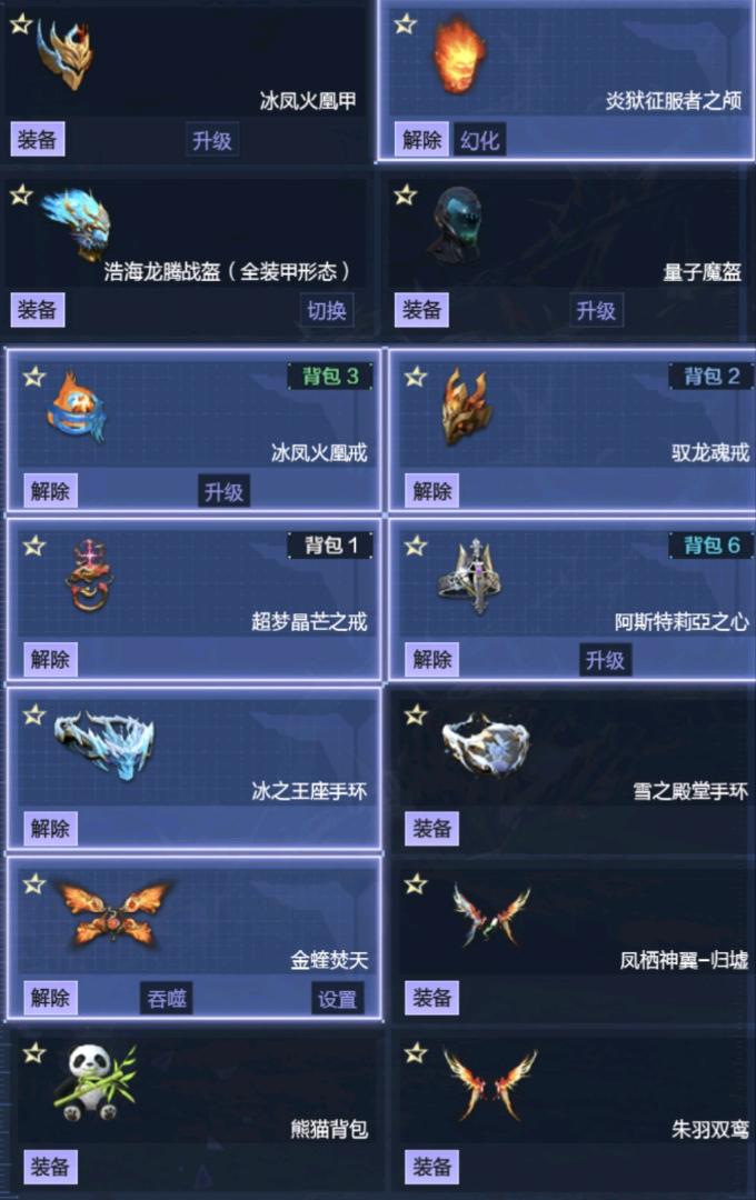 天耀五件套神御四件套⭐达瑞纳➕三女巫⭐金蝰焚天翅膀➕脱离翅膀⭐晶体超梦戒⭐锋影强能臂铠海龙头⭐山海套
