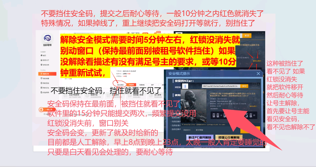 2小时起步帮解安全模式15分掉线{看清楚哦}。价格已经很便宜了 看好图片介绍 不要盲目下单 撤单 (有时候无反应多试几次因为解除需要10分钟左右快的话五分钟要耐心等待,要符合时间要求) 解除一次就行了 就可以一直玩,不需要重新解除了{前提是别换电脑}解除不易,希望多多续费,别投诉。比如现在在16号机子。。。下次还来16号机子就不用在解除了!!! 验证码发送后,游戏里窗口别关保持在最前面{不要遮挡不要切到别的窗口去了},耐心等待大概需要5分钟到10分钟左右,解除安全模式要打开好几个窗口加载需要时间的!!!红锁消失之后就可以关闭窗口正常游戏了。千万别关验证码窗口不然是无效解除的!!! 现在解除号主要在线,下单时间长点,稳定点肯定帮解除掉线问题的。
